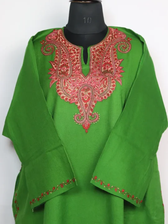 A green pheran in Raffal Wool features hand Sozni embroidery at the neckline in badam motifs. It includes pockets on both the sides for added function. This green pheran brings a gentle Kashmiri touch to everyday winter wear while remaining simple, warm, and easy to layer.
