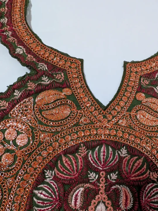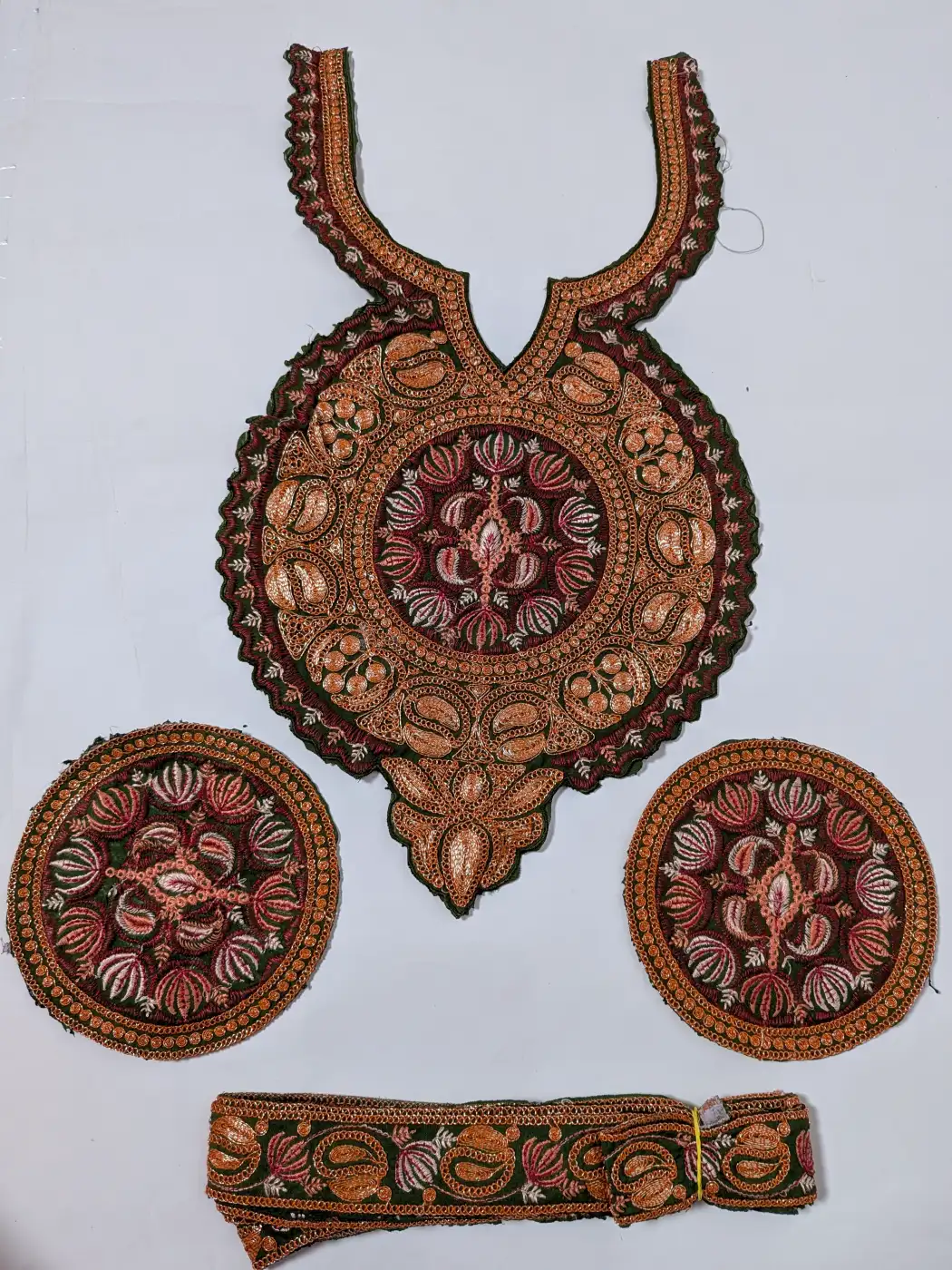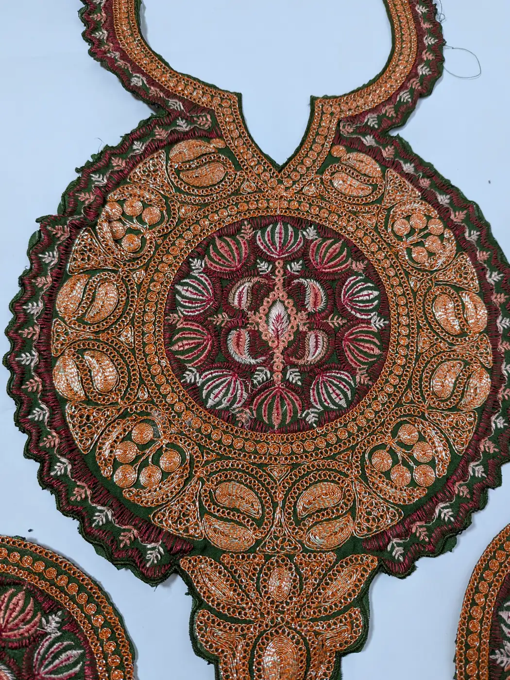The beauty of this patch set lies in its detailed tilla embroidery, where floral motifs are placed on the neck patch and sleeve patches inside round shape. The lace carries continuous embroidery, and this green base adds a rich, traditional depth to the overall look.