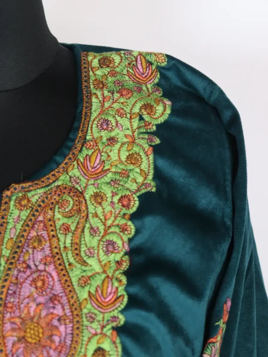 Velvet fabric gives this green pheran a rich texture, while embroidery lends its beauty. At the neckline and sleeves, sozni embroidery reveals badam motifs and huge floral at sleeves stitched in pink and mustard hue and deep floral vine patterns in lime green. The work makes the garment refined and elegant. Soft, cozy, and versatile, this pheran is an ideal addition to a winter wardrobe.