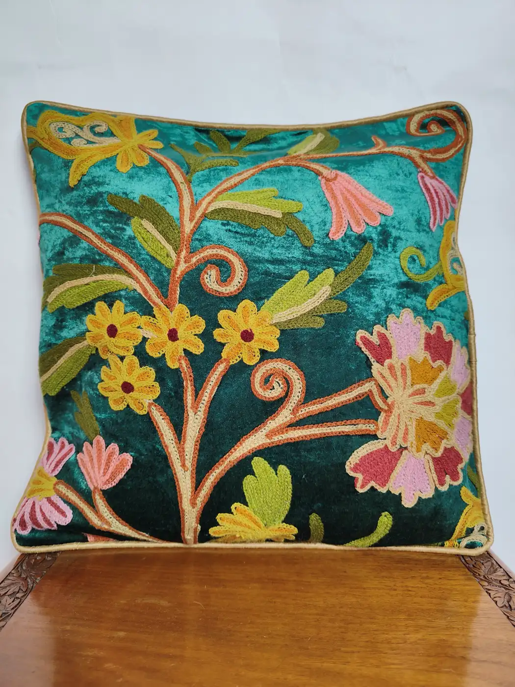Bring home a whisper of the valley’s elegance with this luxurious Green Velvet Cushion Cover, where heritage artistry meets modern allure. Available in sizes 16 inch, 18 and 24 inch.This Kashmiri cushion cover is made from premium viscose velvet.