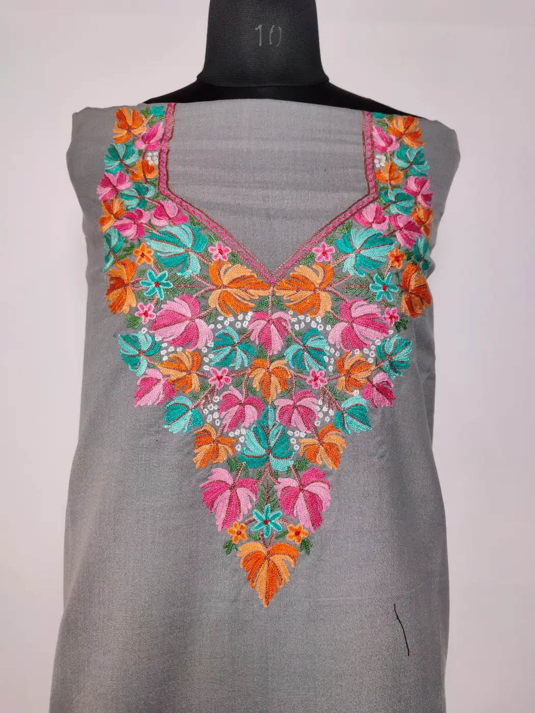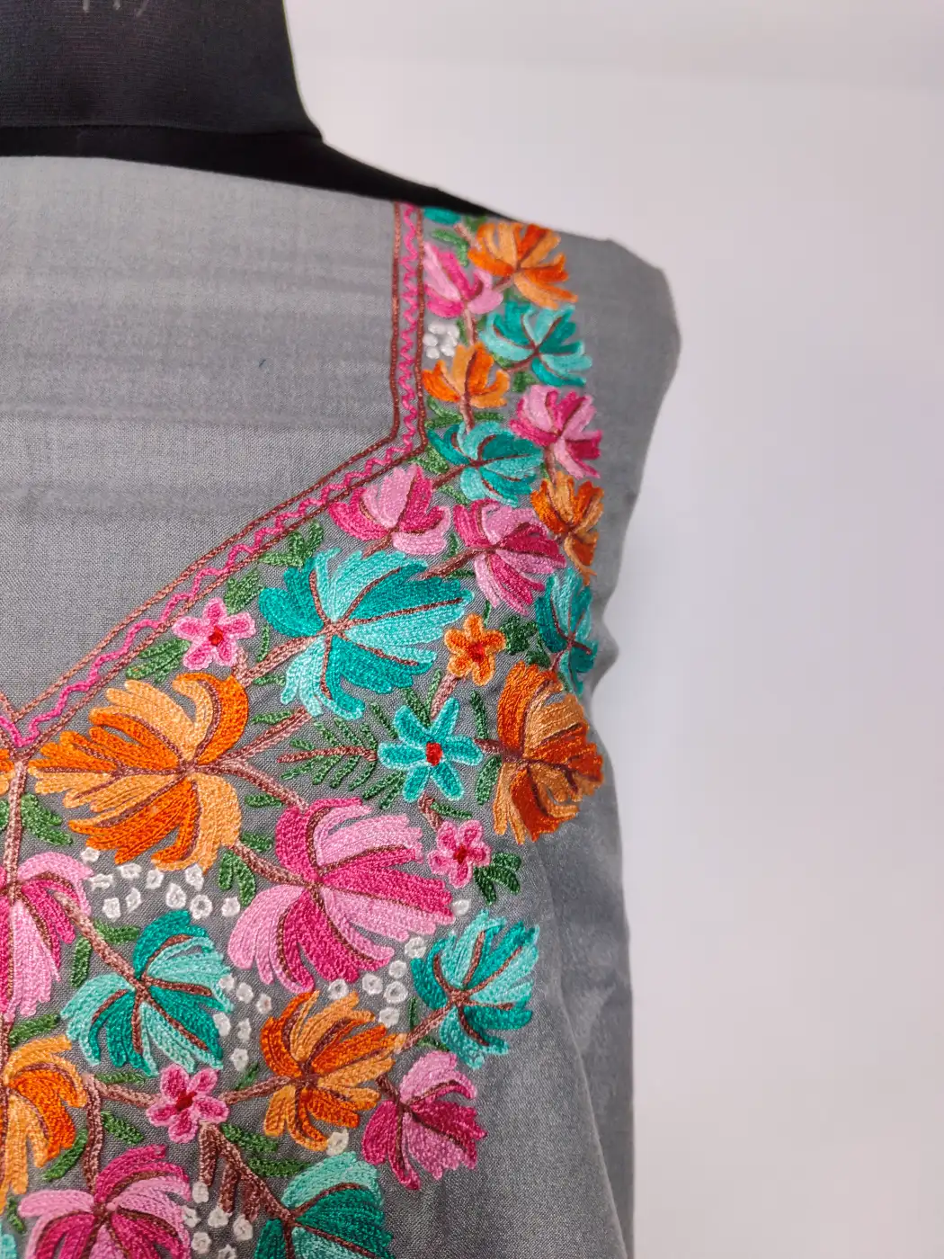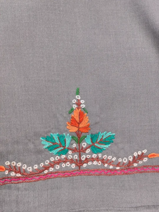 A refined Kashmiri unstitched 2pc suit featuring floral embroidery along the neckline. Crafted in grey summer cool cotton fabric and adorned with hand aari work, this 2pc unstitched suit can be stitched to your preference.