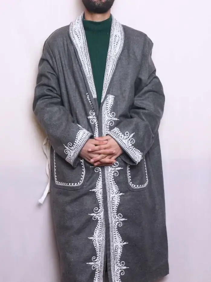 This grey Gown is a timeless piece. It features stunning Aari embroidery. It is perfect for winter wear, and it combines traditional elegance with contemporary style. Its soft fabric ensures warmth and comfort, making it an essential winter garment.