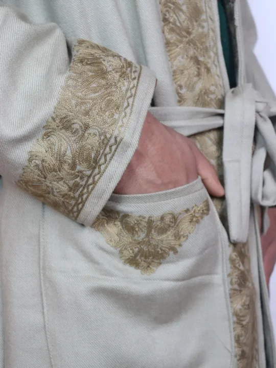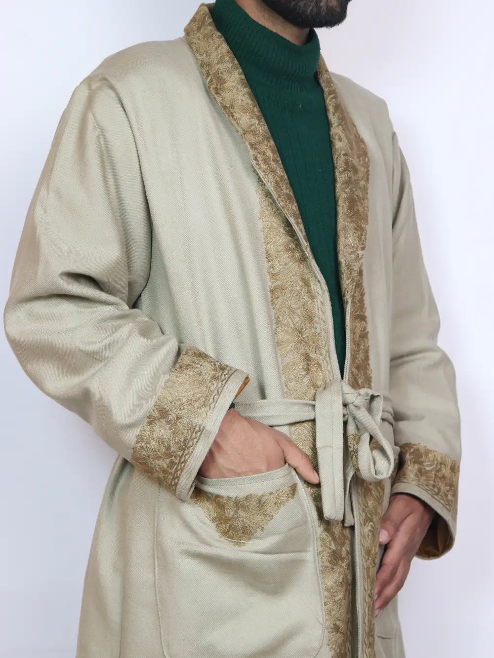 Aari embroidered flowers trace the front side collar, both sides pockets and sleeves of this embroidered gown in cashmilon wool. It has chest size 46 inches and length 50 inches ensure generous room. It has belt included which provides the option for fitting it according to your own fit.