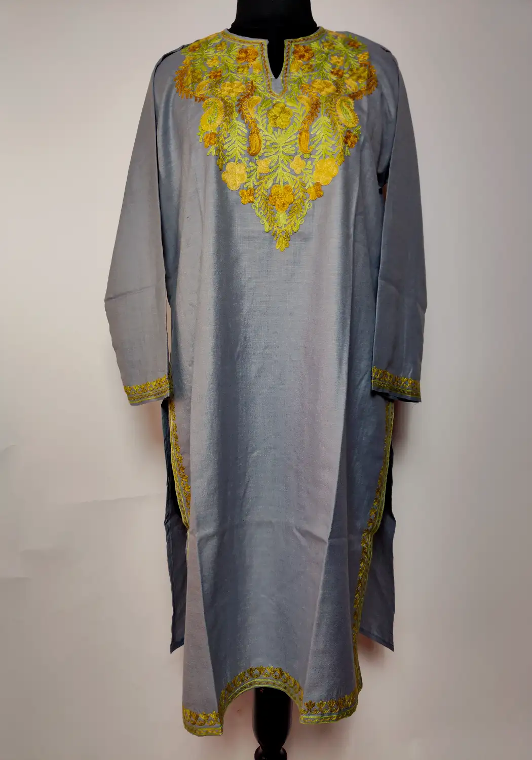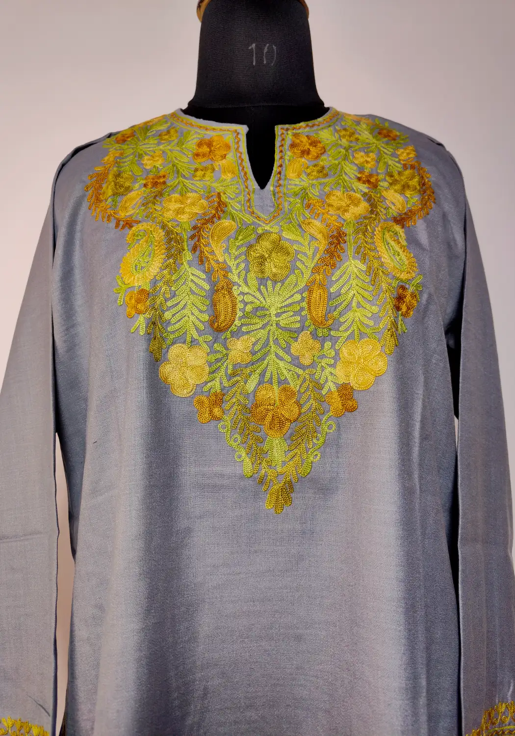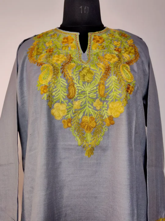A soft grey colour tone defines this aari work kurti made from ruby cotton. Floral badam embroidery decorates the neckline, which adds a gentle detail without overwhelming the design. The kurti feels light, which makes it a comfortable choice for daily wear.
