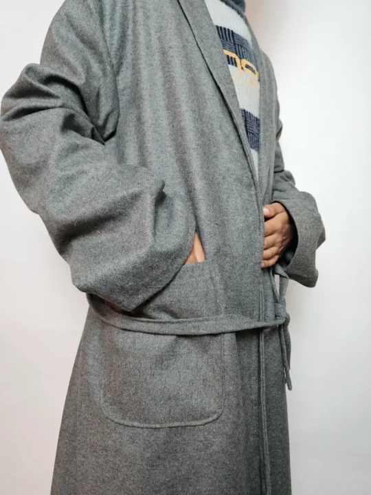 Woven from tweed in a rich grey tone, this plain Bathrobe or gown offers roomy comfort. This Bathrobe features two pockets on the front sides and it comes in 54 inches chest size by 48 length, which makes it effortless to wear around the house or over layers. At 2849, this piece balances value and refinement, it carries a faint Kashmiri mood in its simple finish and warm, textured fabric.