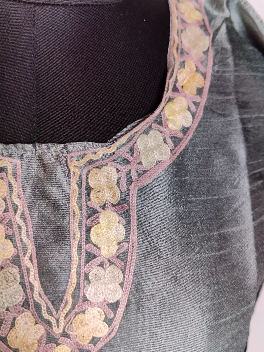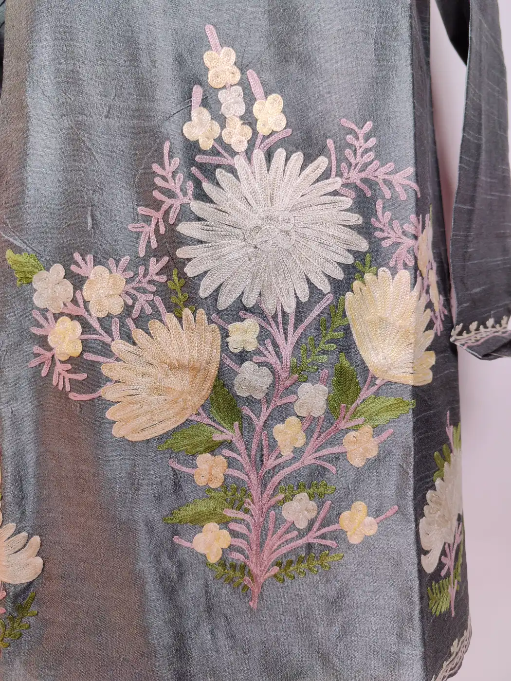 The richness of grey silk is paired with neat aari floral embroidery at the neckline which creates a striking yet balanced look. The flowers sit beautifully at the front panel, which enhance the overall fit. It is a charming Kashmiri style kurti that feels festive without being heavy and makes it ideal for daily wear.