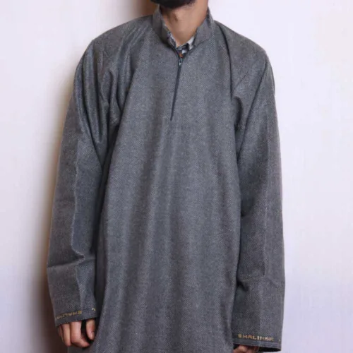 This medium brown tweed pheran is designed for warmth and style, with a beautiful cut that makes it ideal for winter. It is a perfect blend of Kashmiri heritage and comfort.