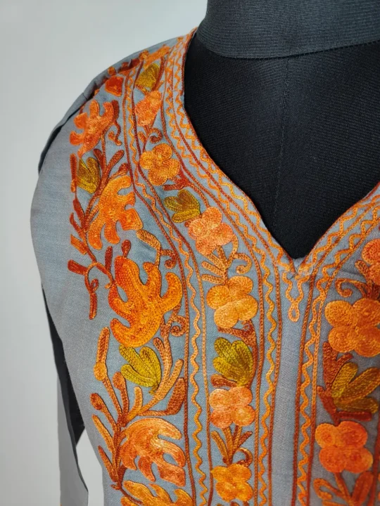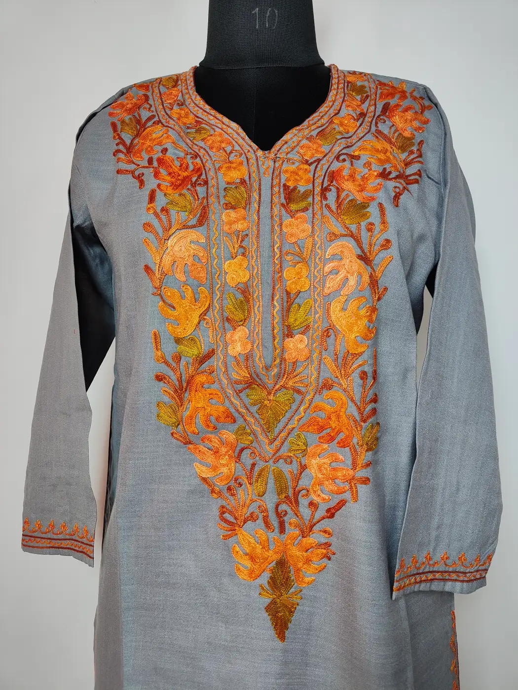Kashmiri kadhai kurta set crafted from ruby cotton comes with kurti and trouser. Its grey colour highlights floral aari embroidery on neckline.