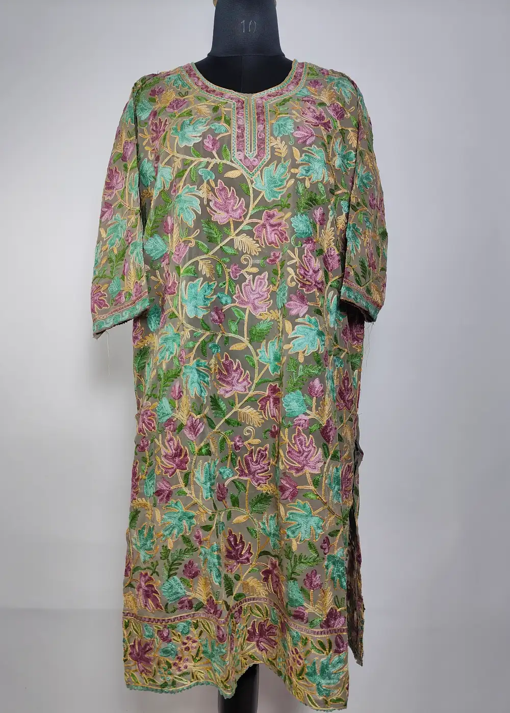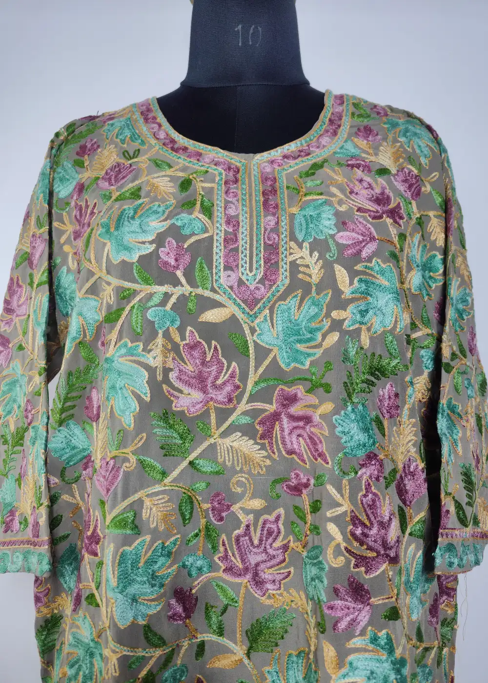 This Greyish-Green georgette kurti designed with chinar aari on both sides that gives it a decent and classic feel. The fabric sits well and feels comfortable through the day. A perfect pick among best kurti for girls and best kurti online shopping options.