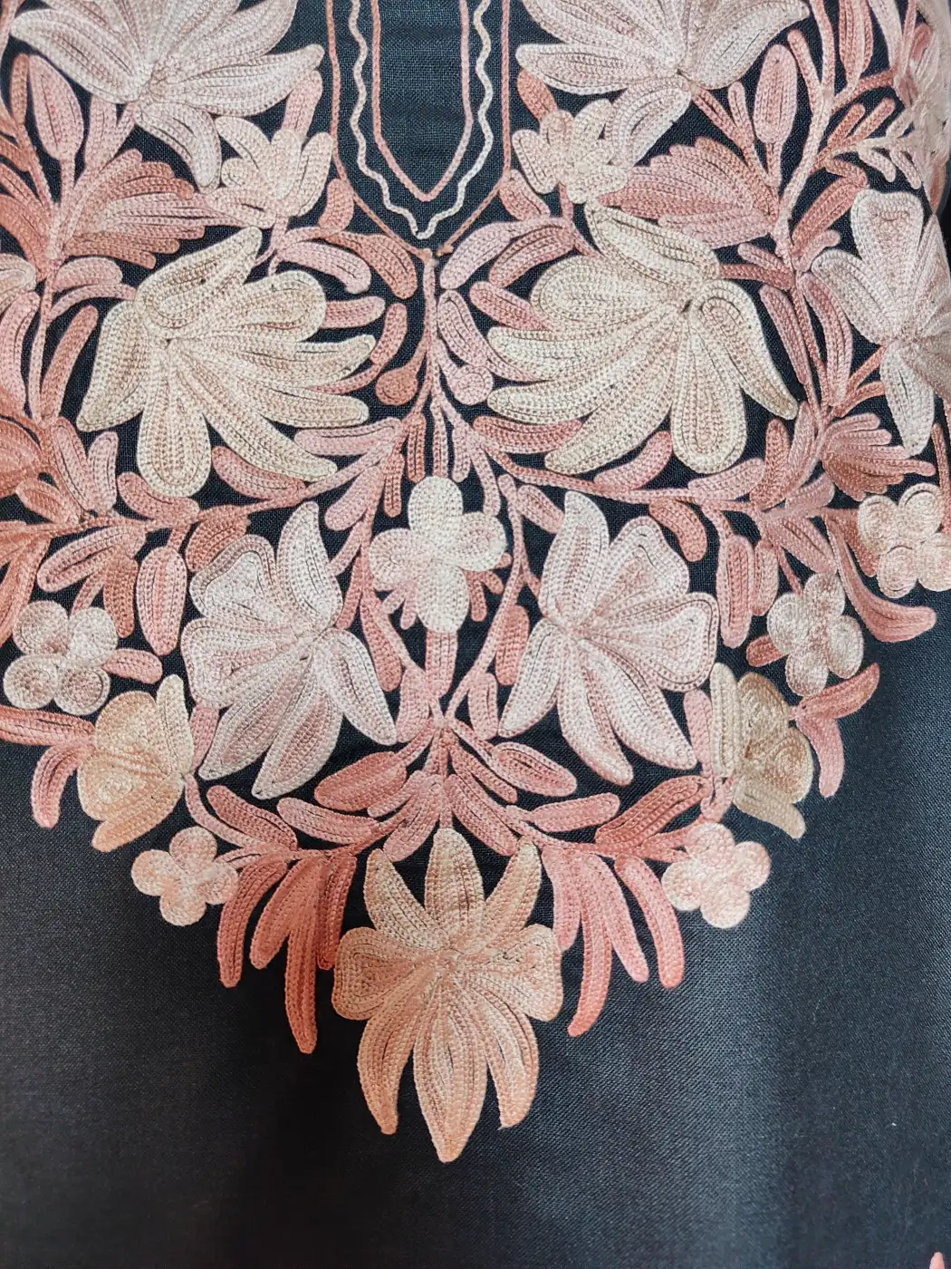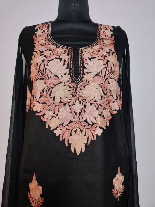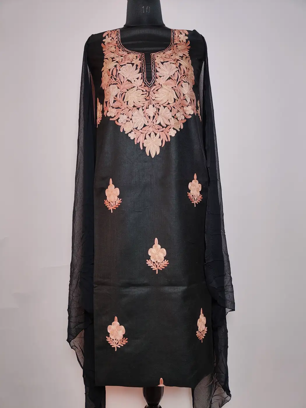 There’s a quiet elegance in how the bootis are placed across the front panel of this Kashmiri black 3pc kadhai suit. The neckline carries floral aari embroidery, adding just enough detail. With unstitched kurti, trouser, and dupatta, it lets you decide the final look with ease.