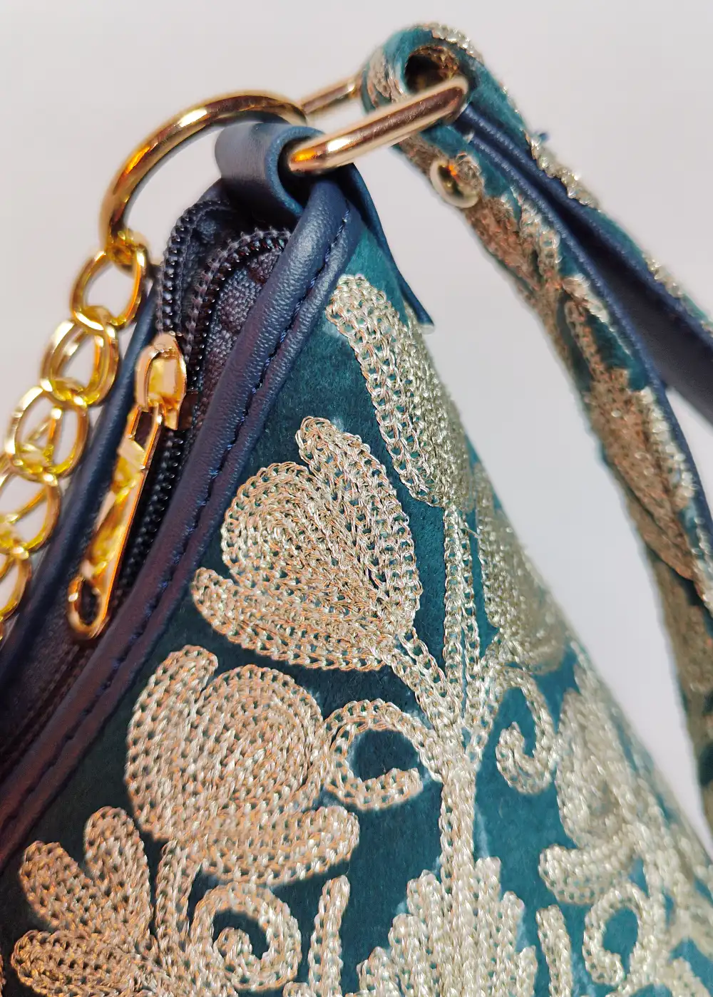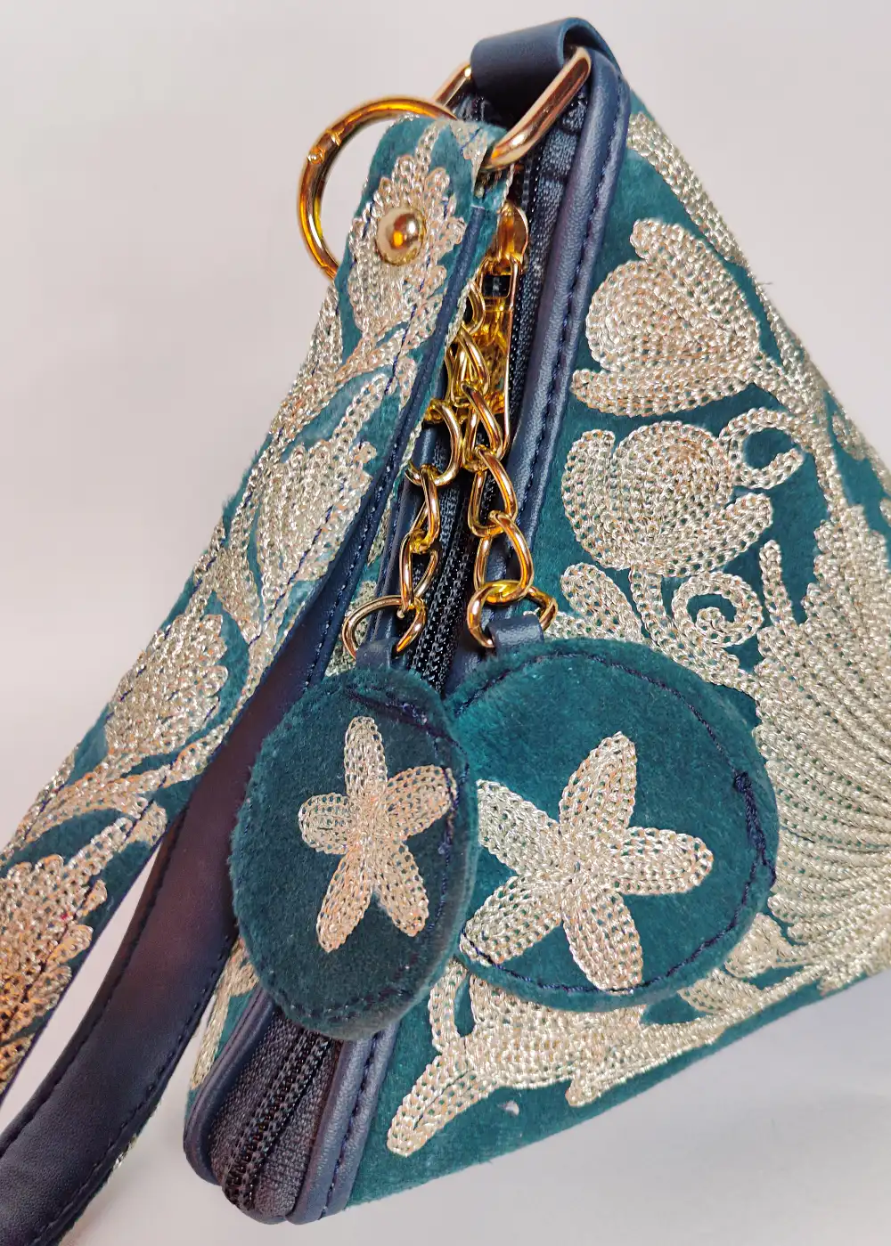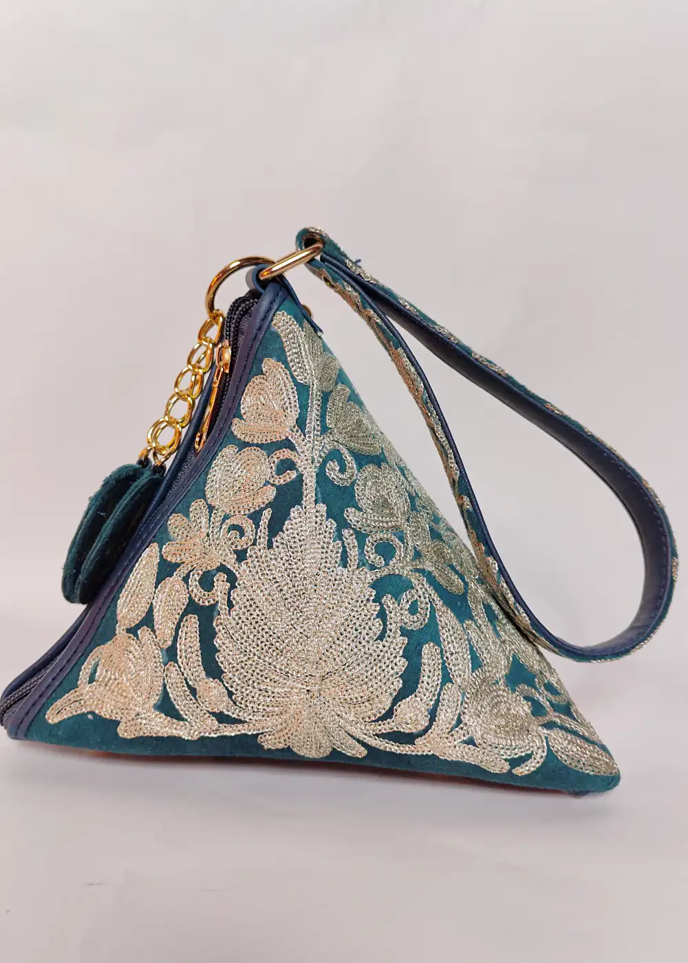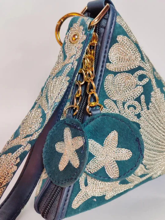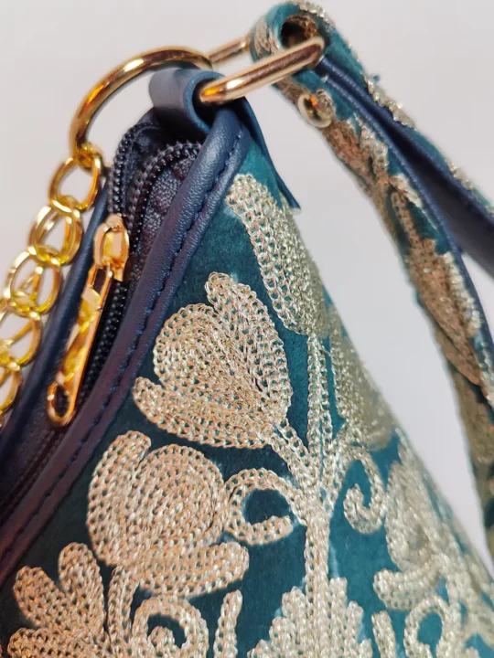 The velvet base of this triangle potli bag combined with fine and detailed silver chinar posh bagh zari embroidery creates a beautiful festive accessory. The thread work adds a graceful shine that looks elegant with traditional clothing. A good choice for weddings, functions, and evening gatherings.