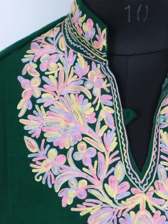 Made in Cashmilon Wool with floral Aari at the neckline, this green best short kurtis gives a calm look. Chest size 44 and Length 40 offer comfortable room for layering. This best short kurtis keeps the Kashmiri work modest and the piece easy to wear.