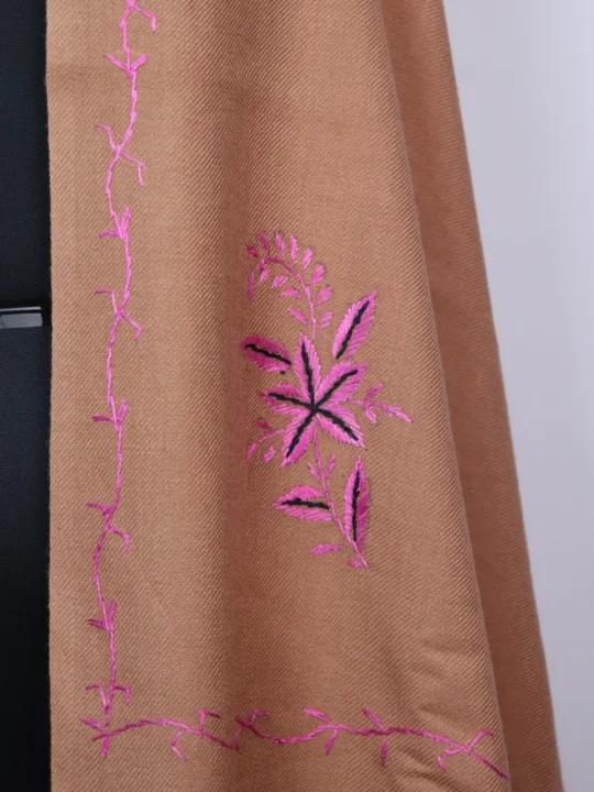 Prepared from cashmilon fabric, women shawl is styled in peach colour. It showcases hand sozni embroidery around border and florals in booti style.