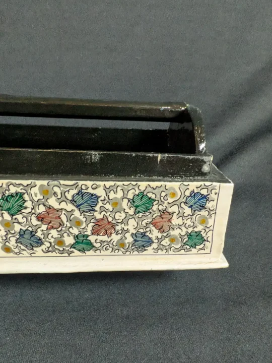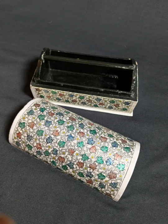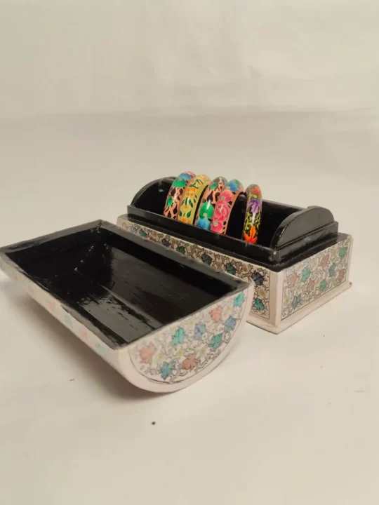 This Kashmiri paper mache bangle box comes with detailed design paper mache and is carefully hand painted with small chinar patterns all over, giving it a rich and elegant look. It keeps bangles safe and neatly arranged while also adding a classic touch of Kashmiri art to your space. A lovely piece for everyday use and a thoughtful gift for someone who likes traditional handmade items.