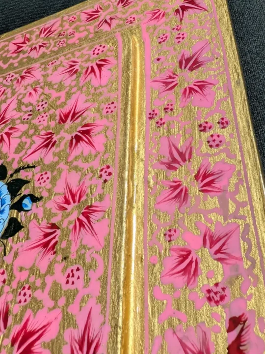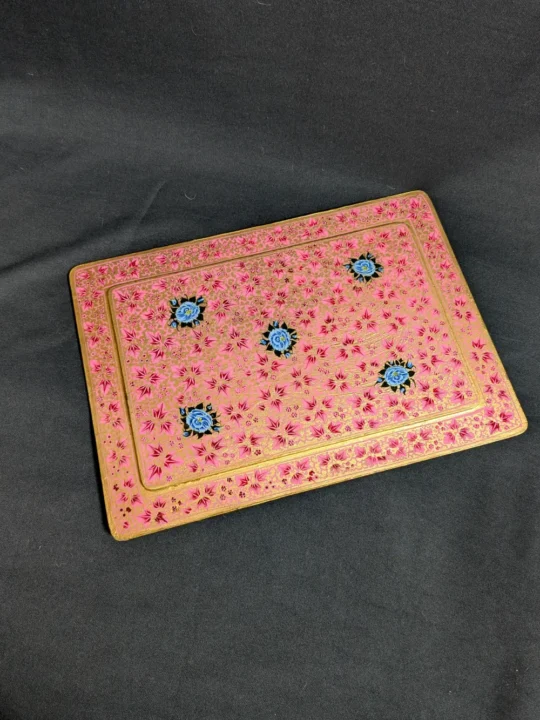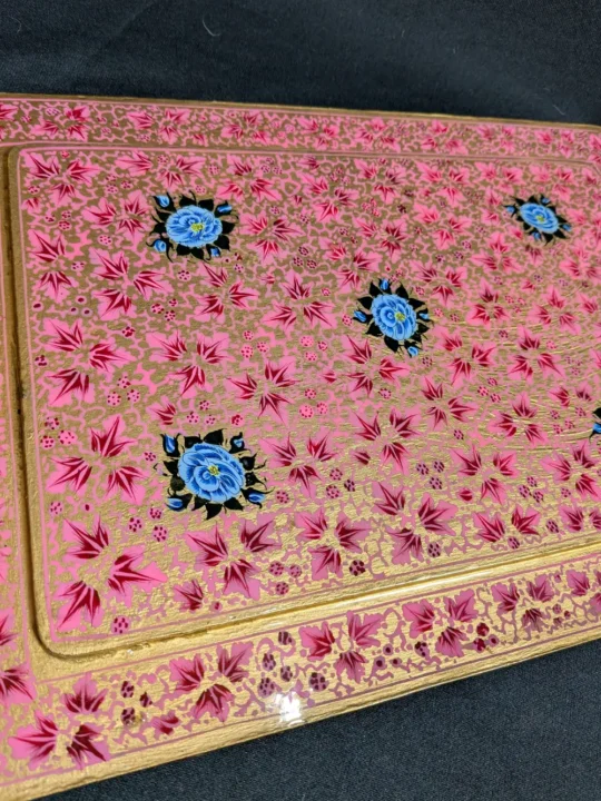 This Pink dining table mat is made in traditional design paper mache style with fine hand-painted details that give it a rich and elegant look. The surface is decorated with small floral leaves patterns, adding a beautiful Kashmiri touch to your table setup. It works well as a place mat for daily meals and also protects the surface from heat, making it a useful heat resistant table mat. A simple way to add colour, tradition and protection to your dining space at the same time.