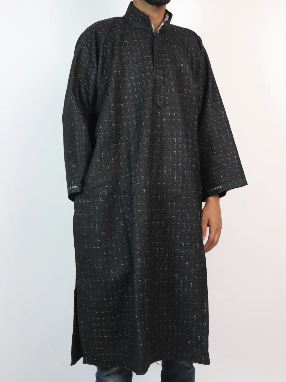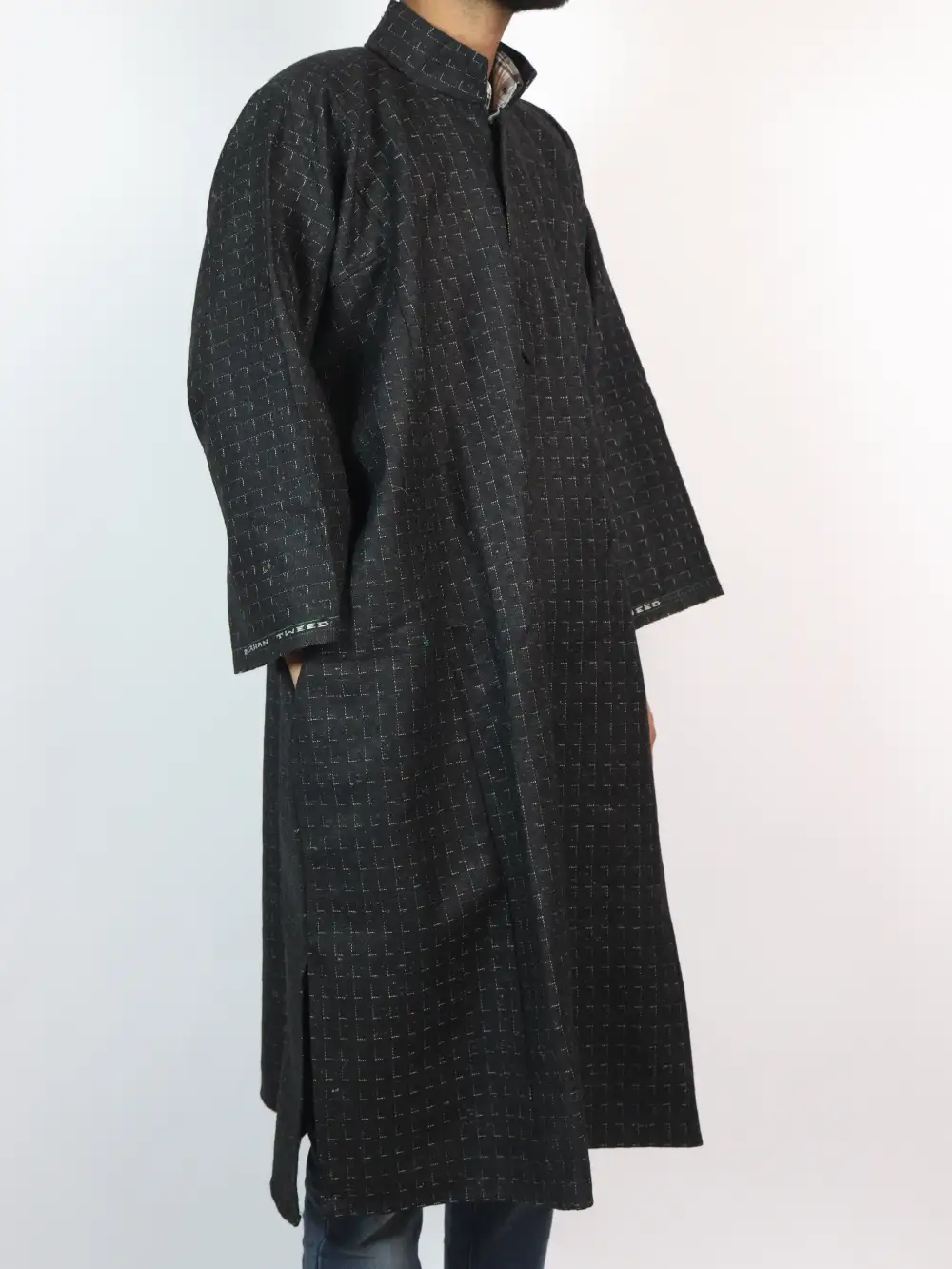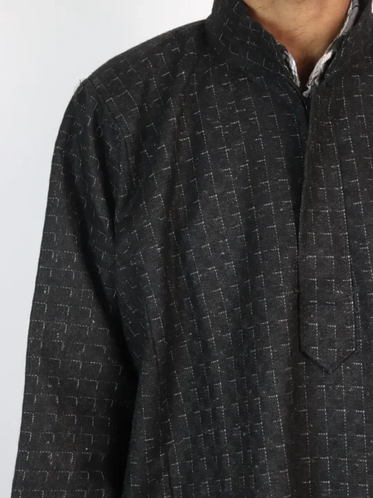 A sturdy men’s black check pattern tweed piece, tailored for cold weather. Its style reflects Kashmiri roots, which makes it more than just clothing. It is durable and comfortable, it is a dependable choice for winter. It has been worn for generations, such garments carry cultural depth while keeping you warm in the harshest days of the season.
