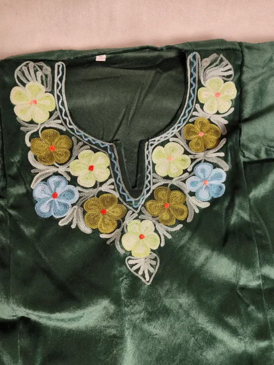 Made in soft Makmal, this dark green Pheran Set for 6-7 years old girl, features green and grey floral Kadhai around the neckline, which gives it a gentle festive grace. The fit—chest 38 inches, length 28 inches—keeps your kid warm and easy through winter days. It comes with a matching trouser that pairs perfectly for a coordinated look. It is a must-have for those who love Pheran for kids which is crafted with care.