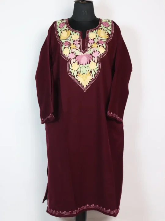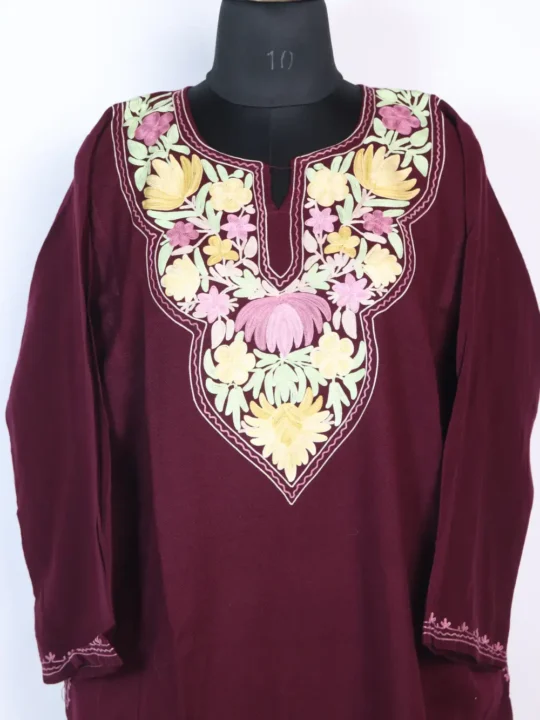 This wine colour cashmilon wool pheran showcases exquisite floral aari embroidery in pastel hues of pink, yellow, and green, creating a soft yet striking contrast. It comes with two side pockets for convenience.