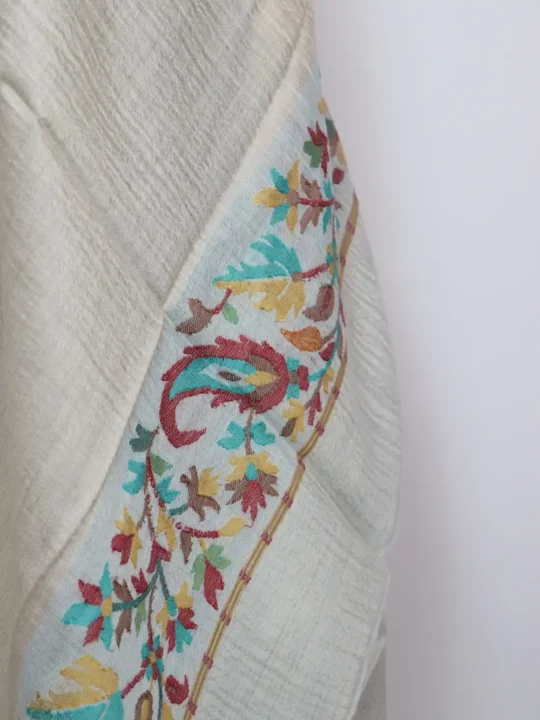 This Kani palla stole is made in fine wool with floral and stripe patterns on the ends. It drapes softly and adds a neat, graceful touch to winter outfits.