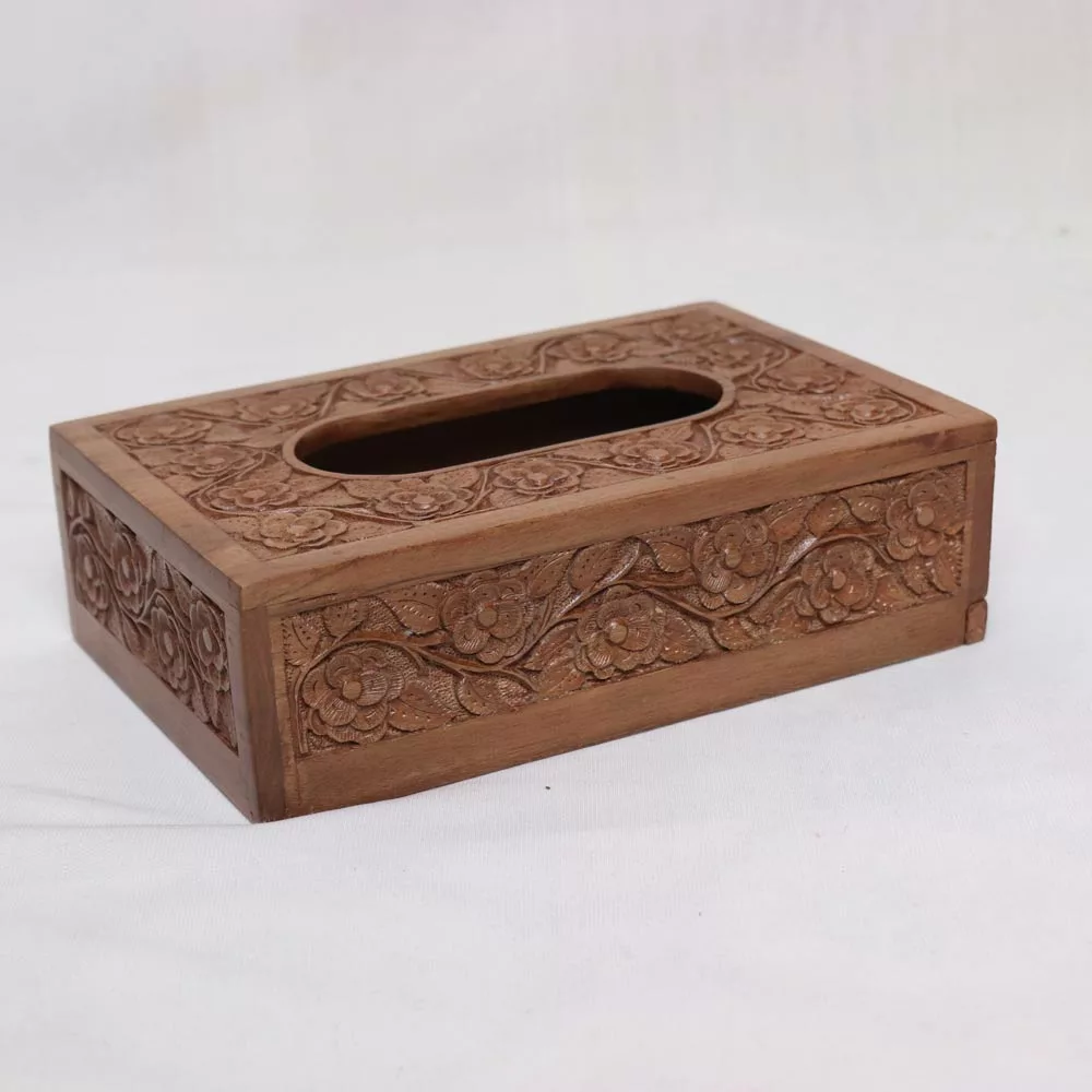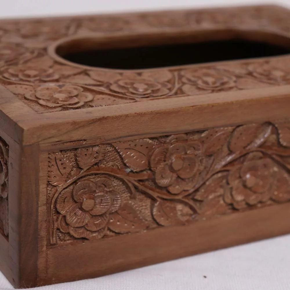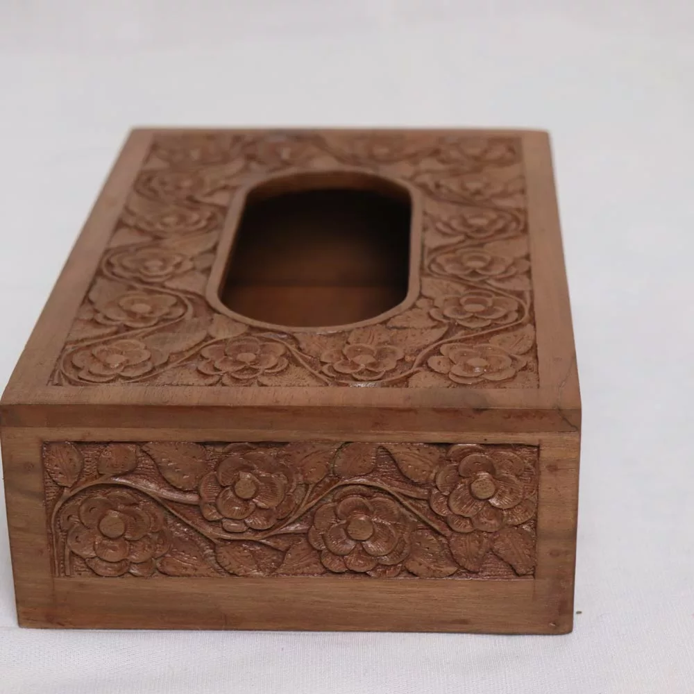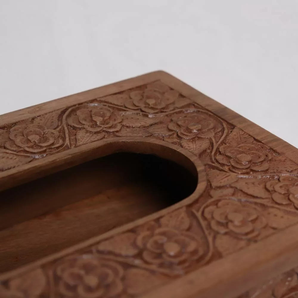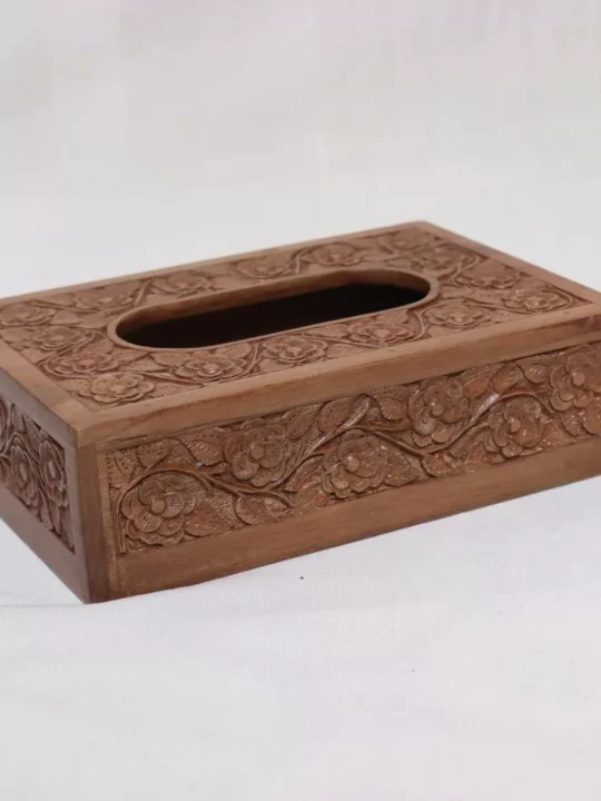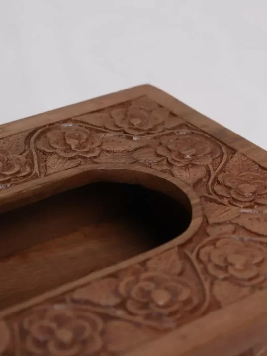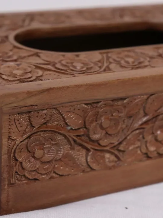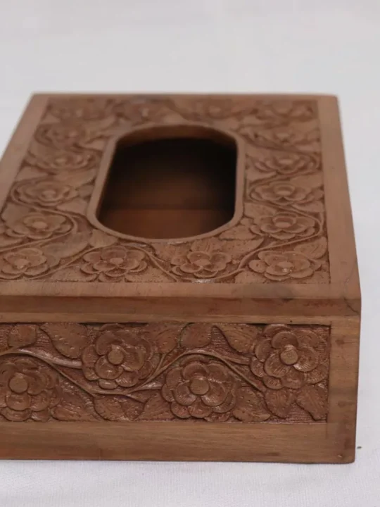 This is a hand-picked walnut wood tissue box crafted by a skilled Kashmiri craftsman. The length of this box is 9 inches, and the height is 2.6 inches. It takes weeks to make this. Hand carving on it is very beautiful and the polish also looks very natural on it.