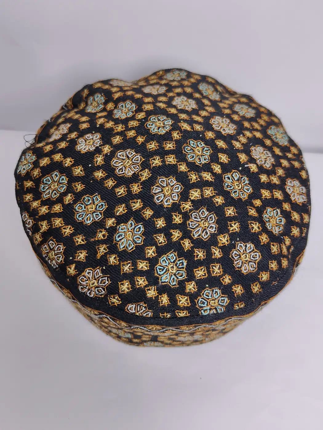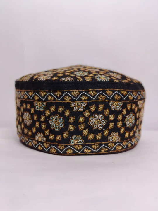 A continuous line of hand sozni embroidery moves around the sides of this black pashmina sozni cap, complementing the floral geometrical motif placed on the crown. This classic topi is crafted in black pure pashmina, brings together heritage design and delicate craftsmanship.