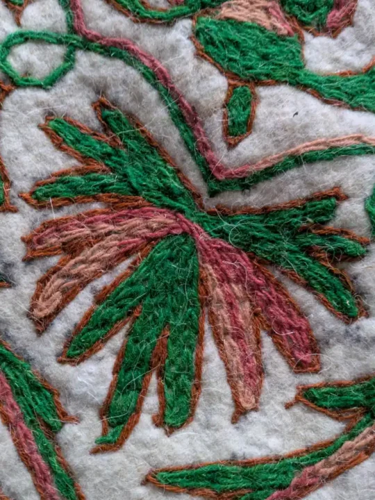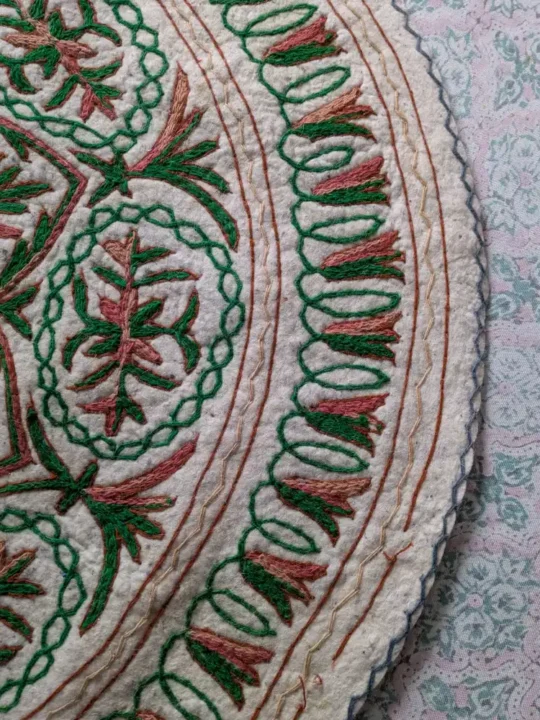 This exquisite circular wool Namda is a perfect embodiment of Kashmiri craftsmanship. It is decorated with intricate Hand Aari embroidery, it features stunning green-brown patterns that symbolize the valley’s rich culture. Its soft wool material offers warmth and comfort, making it ideal for cozy corners or as a centerpiece in your living room. Its unique round shape brings a touch of modernity while staying rooted in tradition. Let this Namda add elegance, beauty, and cultural significance to your home.