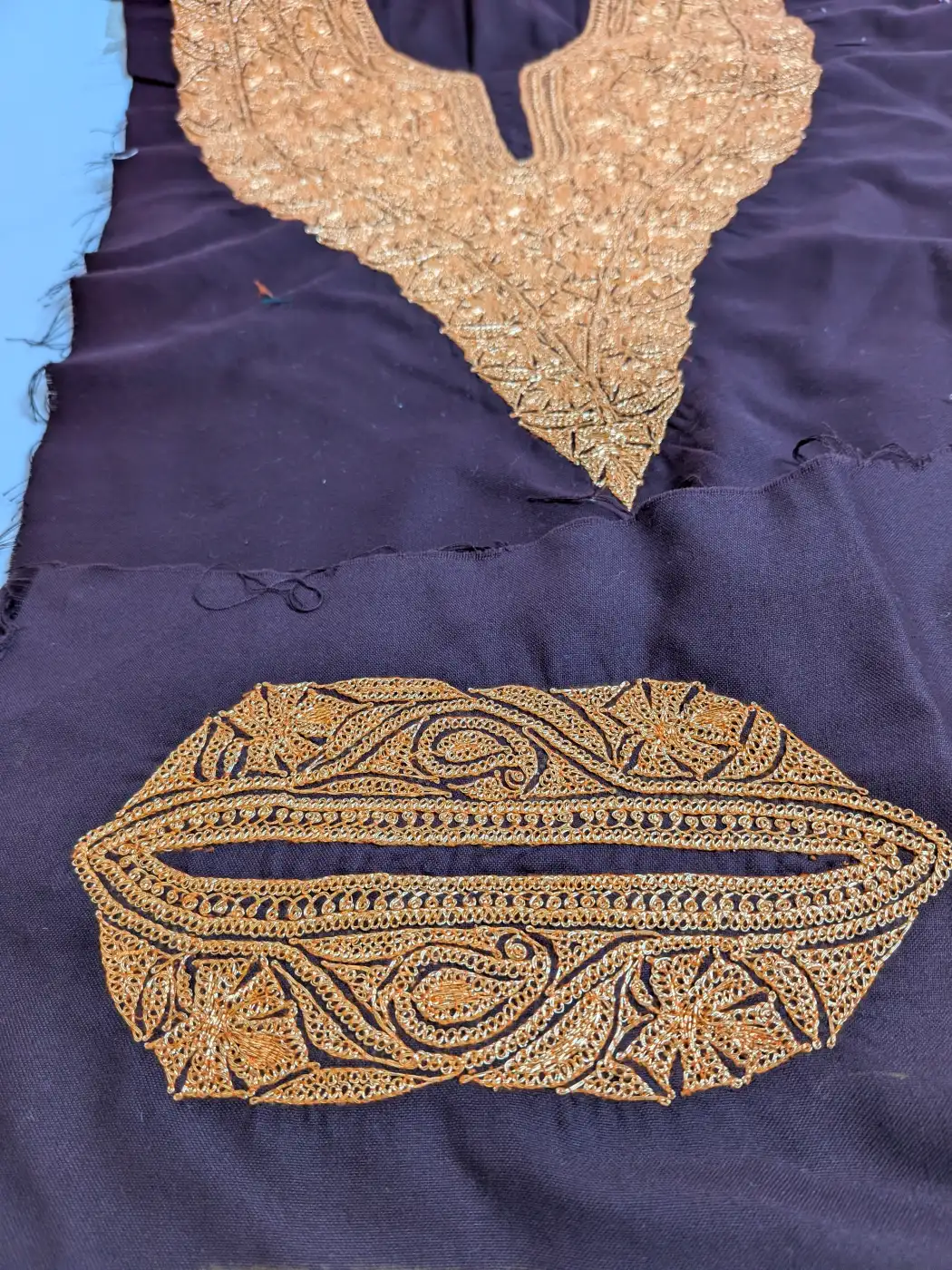 Add luxurious touch to your ensemble with this stunning wine colour hand tilla work patch. The golden tilla thread creates a soft shimmer across the neckline through carefully placed badam motifs. The lace and pocket patch extend the look with continuous detailing. Each stitch is done by hand, which gives it a rich finish that feels suitable for weddings or special occasions.