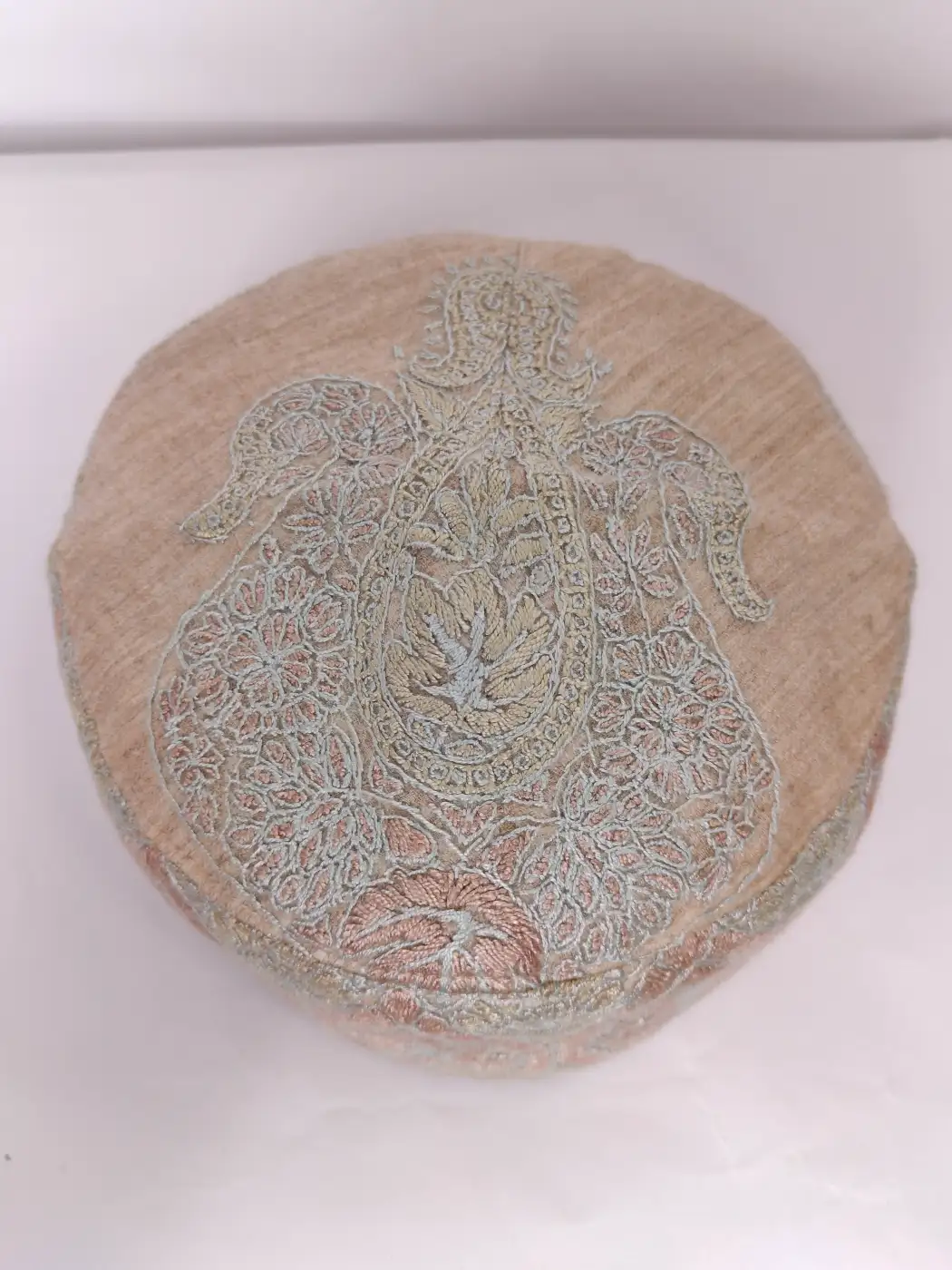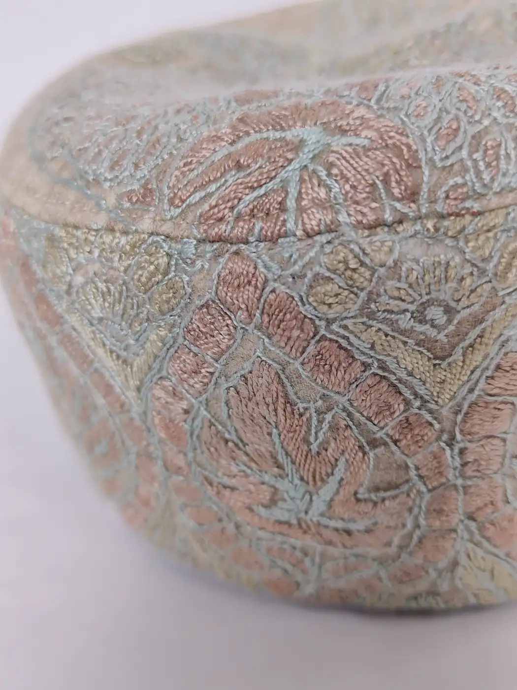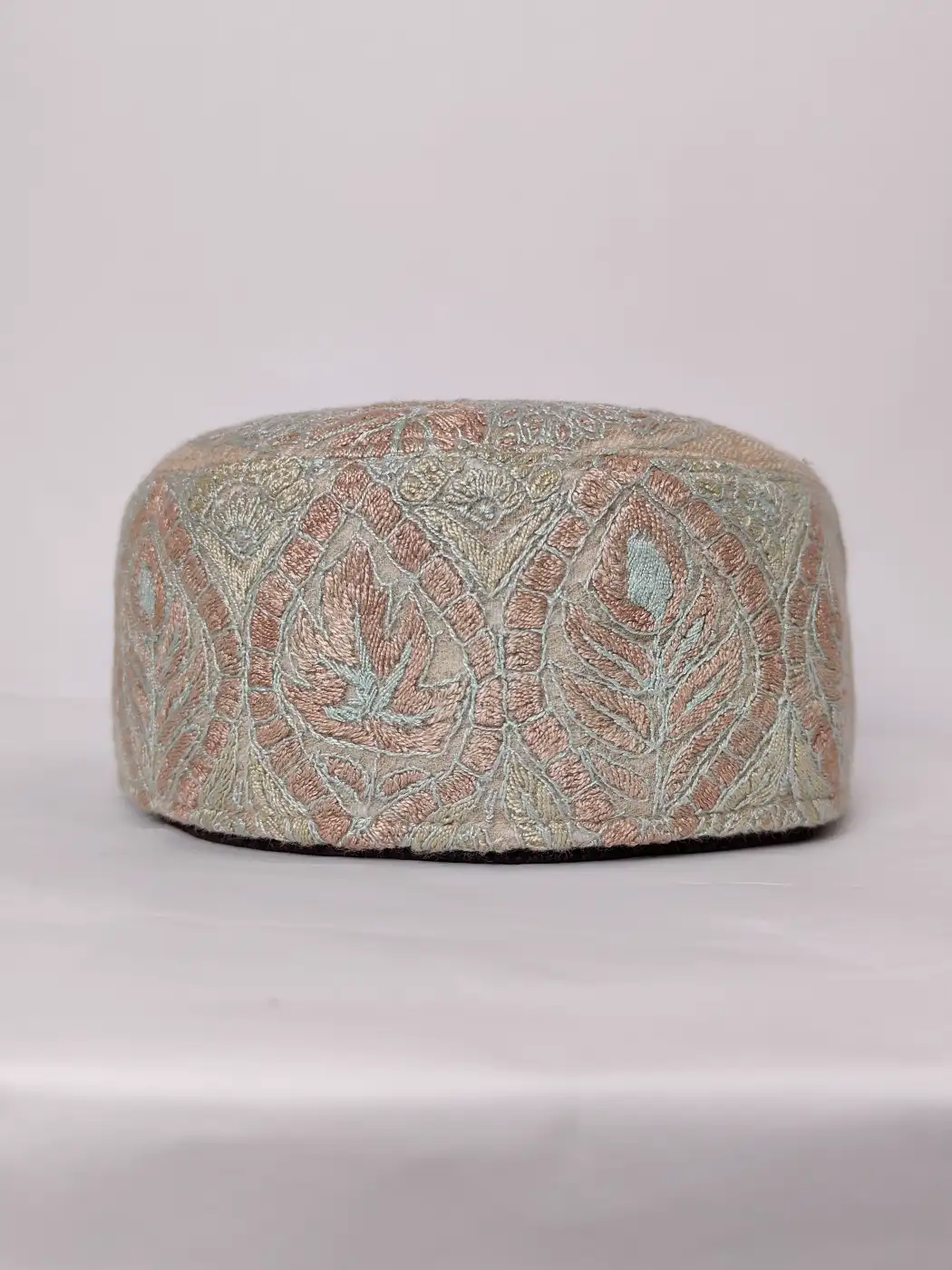 Fine hand sozni stitches bring life to this handmade cap which is made in MP pashmina fabric. At the centre of the crown sits a paisley motif surrounded by delicate floral detailing that spreads outward softly. The side carries a continuous embroidered patterns which add depth and texture while preserving the refined simplicity of traditional Kashmiri design.