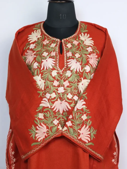 Elegant rustic orange pheran crafted in soft Cashmilon wool, highlighted with floral Aari embroidery around the neckline and sleeves. Two side pockets complete its cozy and graceful look.