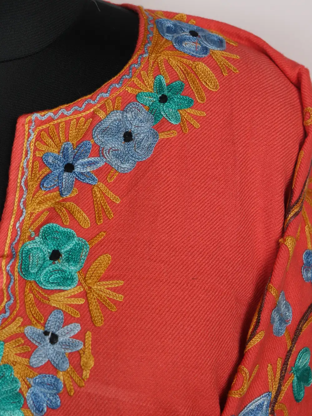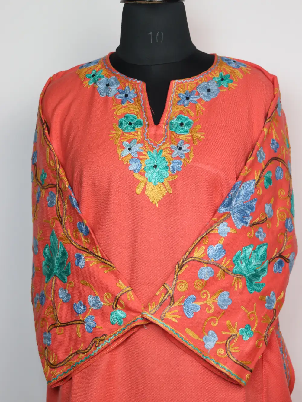This pheran has a smooth cashmilon texture with floral aari embroidered neckline, paired with sleeve jaal work that brings a beautifully detailed look to this feran.