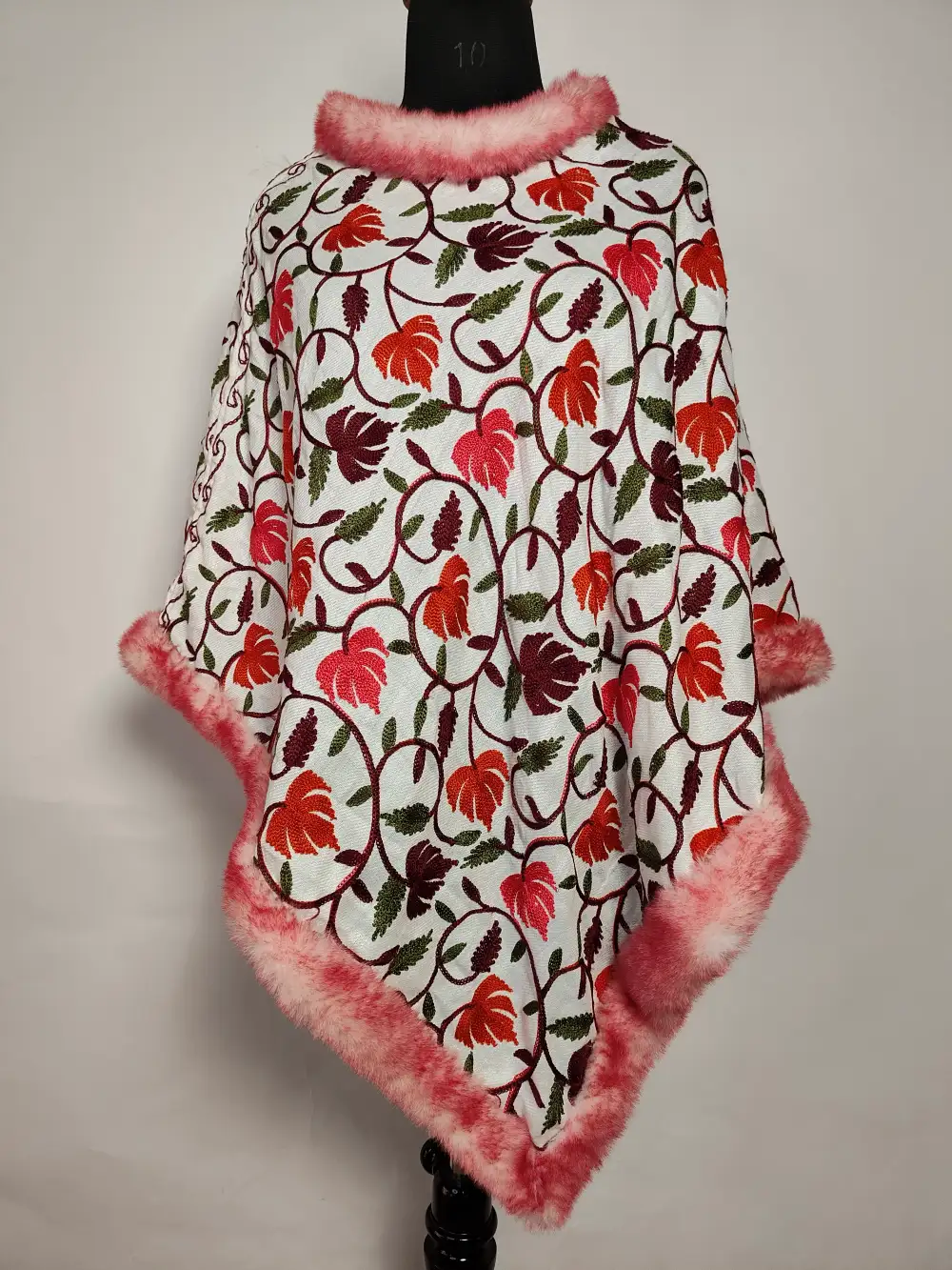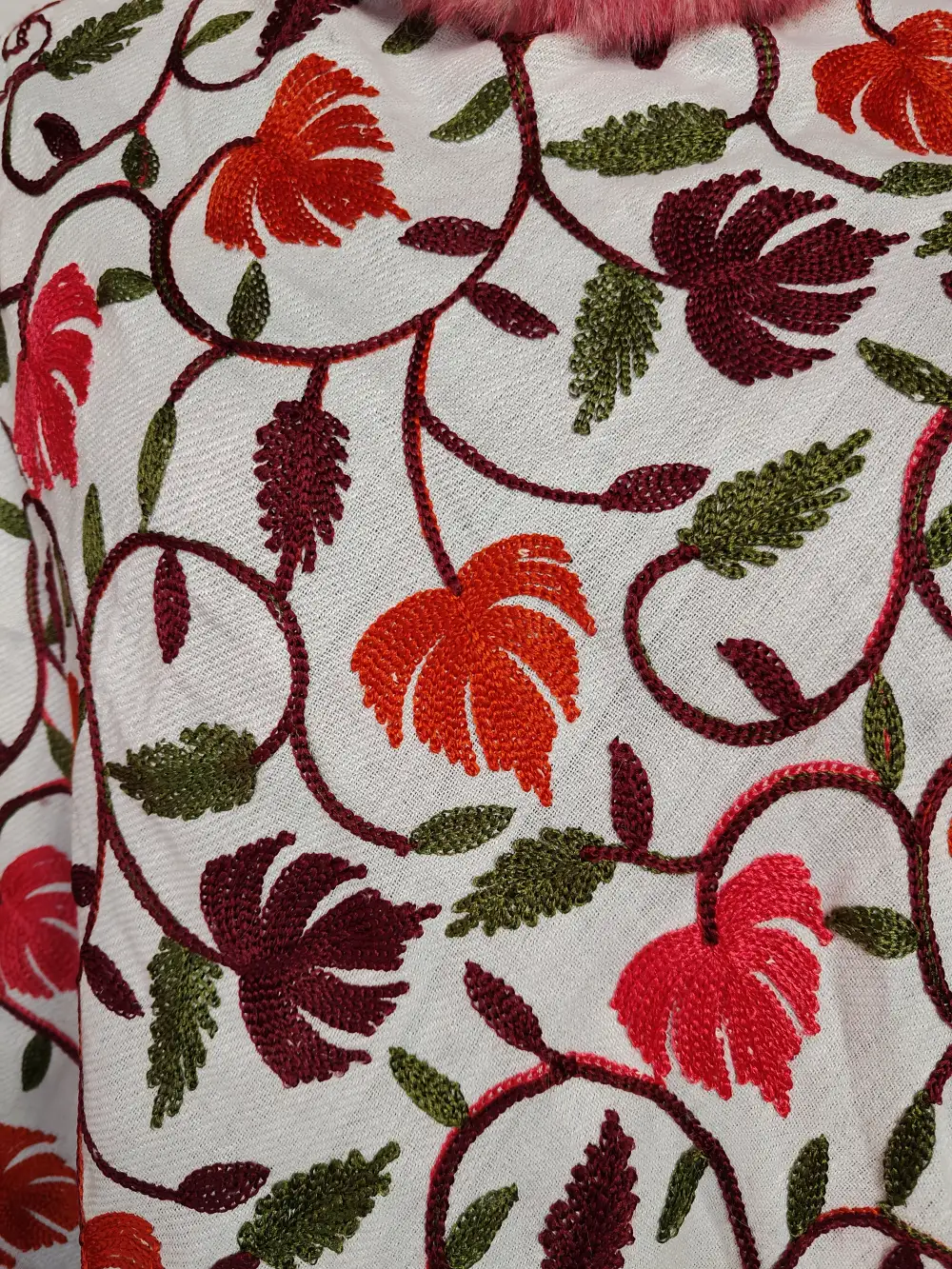 Soft (mulaim) and cozy, this Cashmilon Fur Poncho is decorated with orange and pink chinar inspired floral Aari embroidery that spreads evenly over its white body. Measuring 43 inches side to side and 35 inches in length, it’s designed to keep you warm and graceful through winter days. It comes with no lining for a breathable touch. It is a refined choice among Kashmiri poncho online pieces.