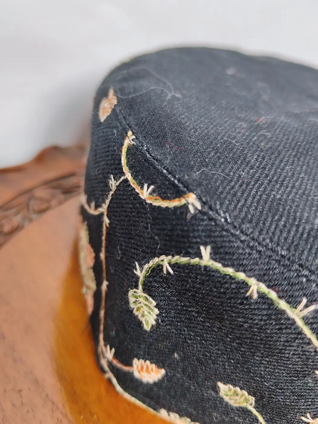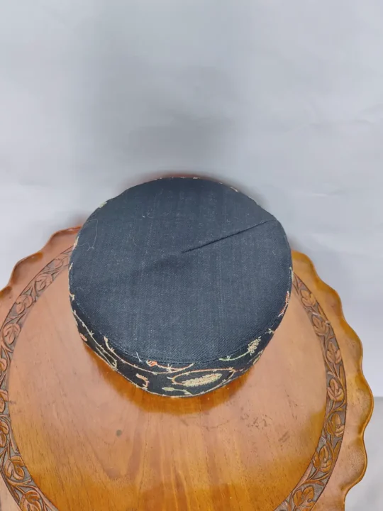 Crafted in black toosha, this Topi features Kashmiri machine sozni embroidery. It offers warmth, soft touch, and winter comfort, suited for daily wear, prayers, and gatherings.