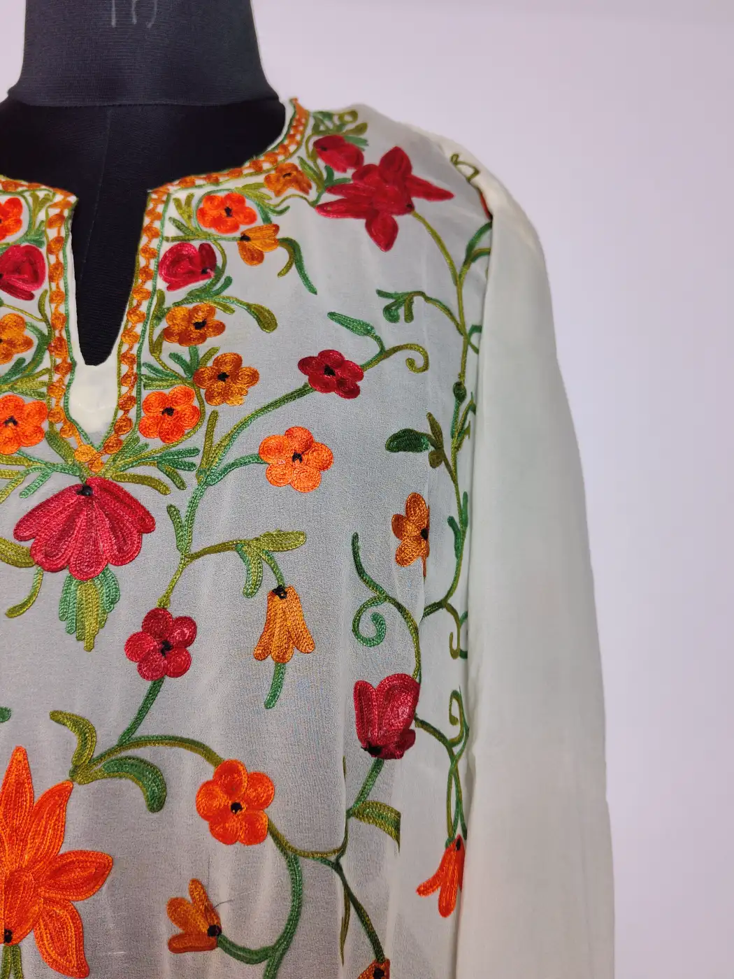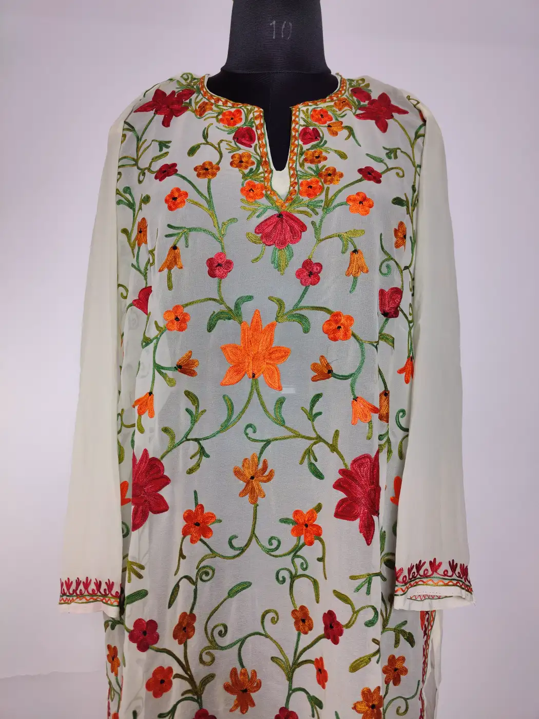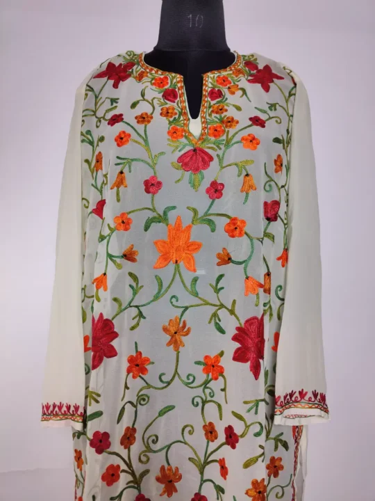Floral motifs at the neckline are followed by delicate vine embroidery all over. Made from cream hue georgette, it offers a light outfit that feels both simple and culturally inspired.
