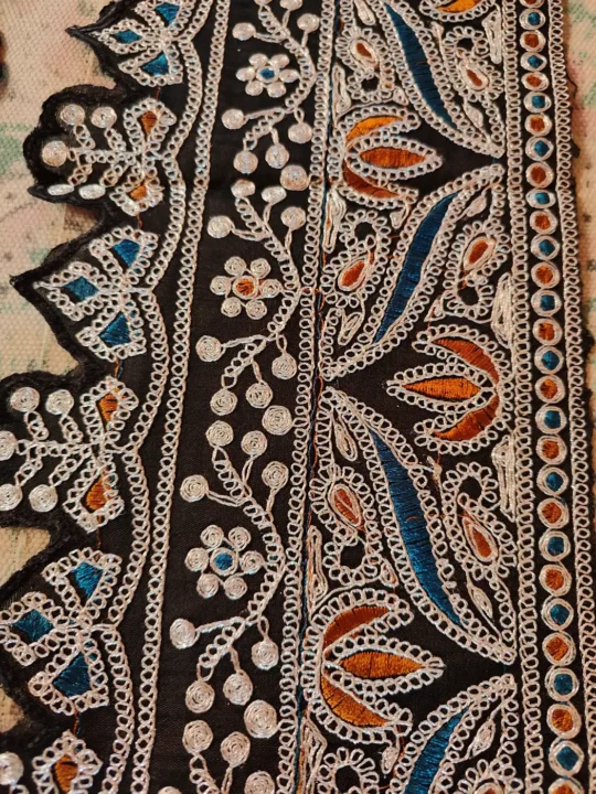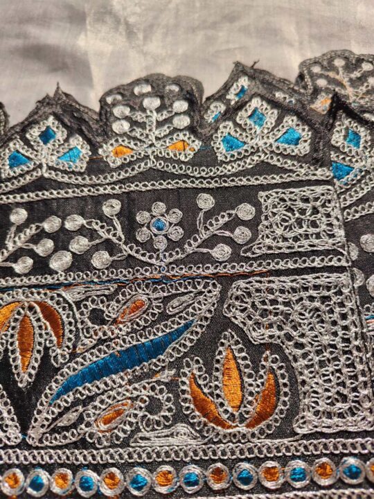 Made using elegant silver tilla work on black colour base, this patch complements Kashmiri garments. It can be applied on qorab style pheran panels, sleeves, and borders. It provides decorative flexibility with traditional handcrafted appeal.