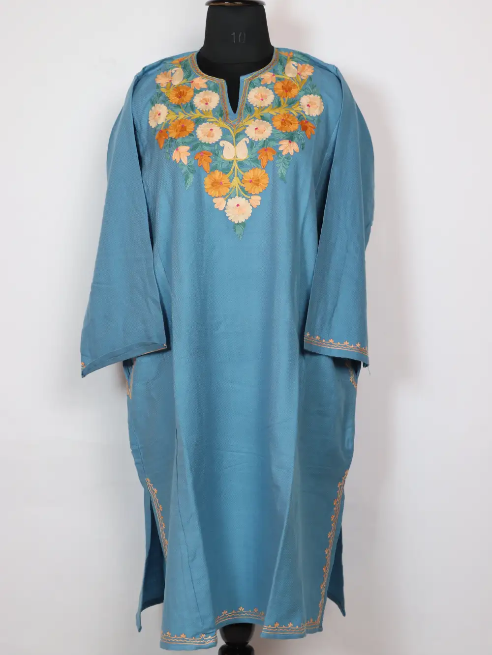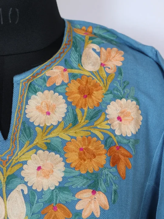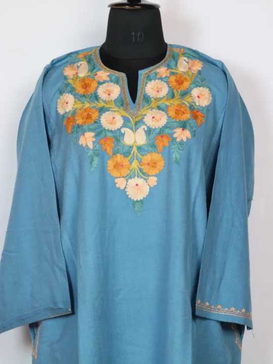 A richly toned blue Cashmilon wool pheran with floral Aari kadhai at the neckline appears in online pheran suggestions for winter staples. It is sized in 52 inches chest size and 42 inches length, and it is also fitted with pockets both sides for comfortable wear and daily use.