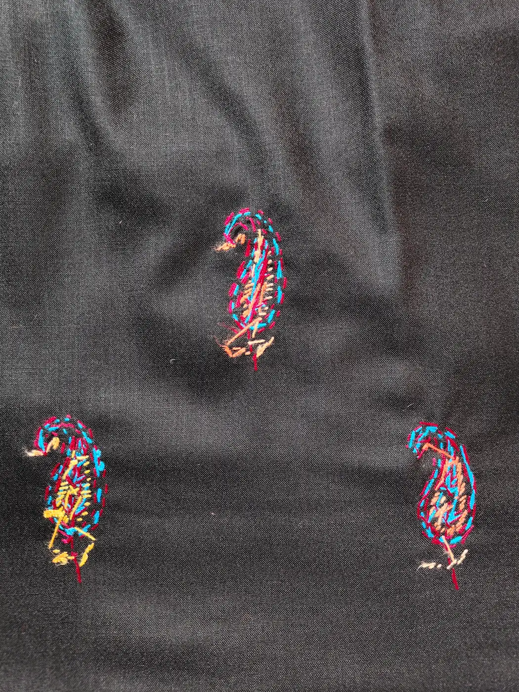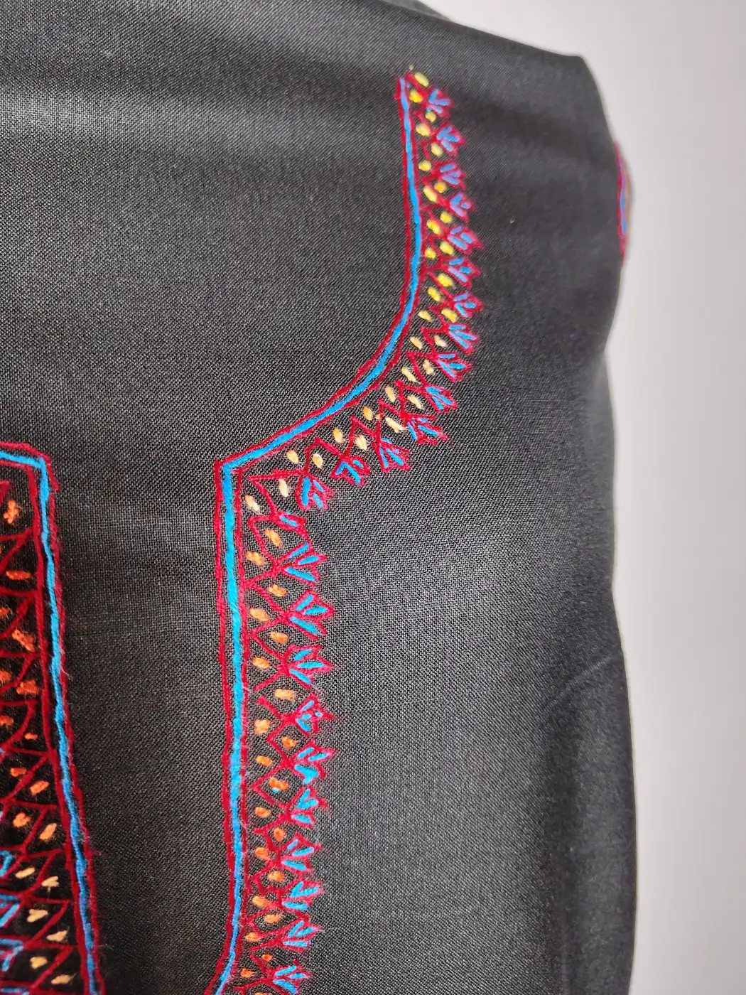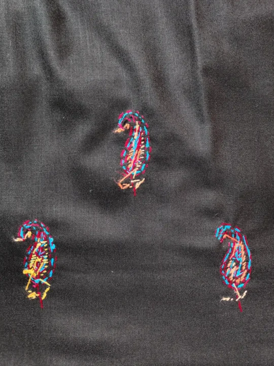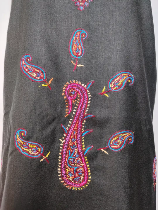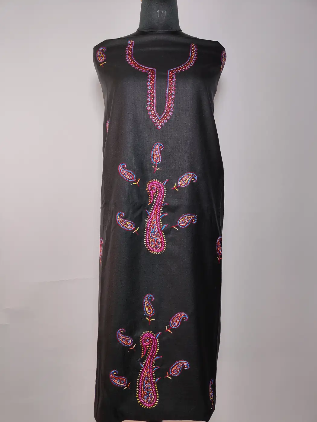 Designed for effortless wear, this Kashmiri 2pc suit features floral hand sozni embroidery across the neckline and badami bootis which are spread across the front panel. This black summer cool cotton base keeps it breathable and refined. As an unstitched 2pc, it allows you to stitch the kurti and salwar your way.