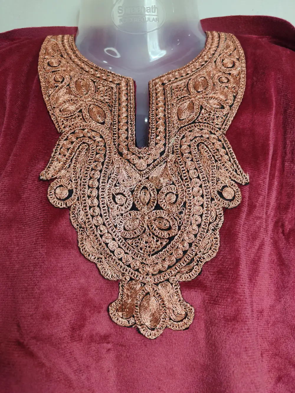 A neat maroon colour 4pc phiran set for 2-3 year old girls in velvet includes cap, pheran, trouser and dupatta with zari tilla work at the neckline and practical pockets both side for little use items.