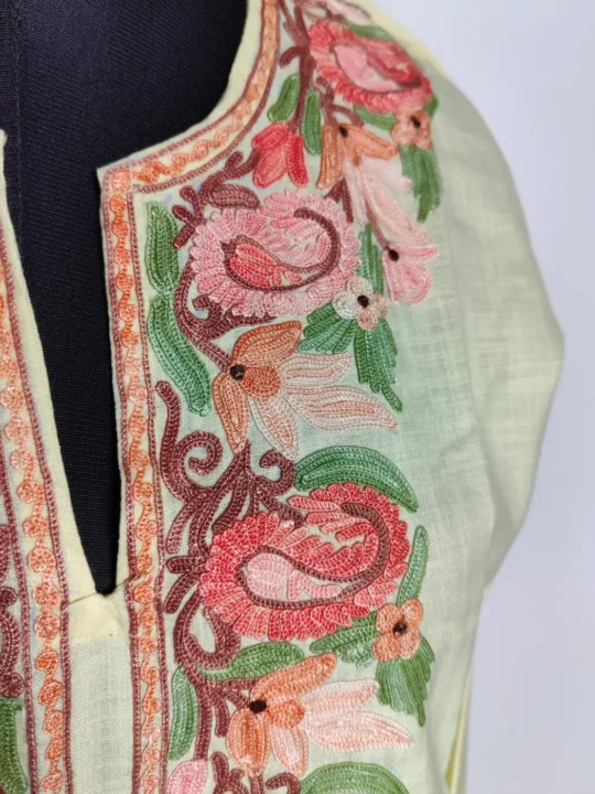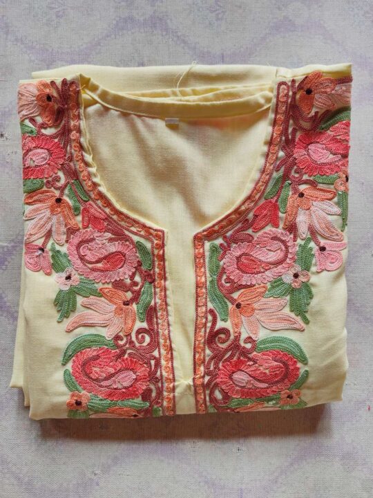 Crafted in cream ruby cotton, this co-ord set reflects Kashmiri elegance with coordinated kurti and trouser styling. Its floral aari embroidery enhances the neckline beautifully.