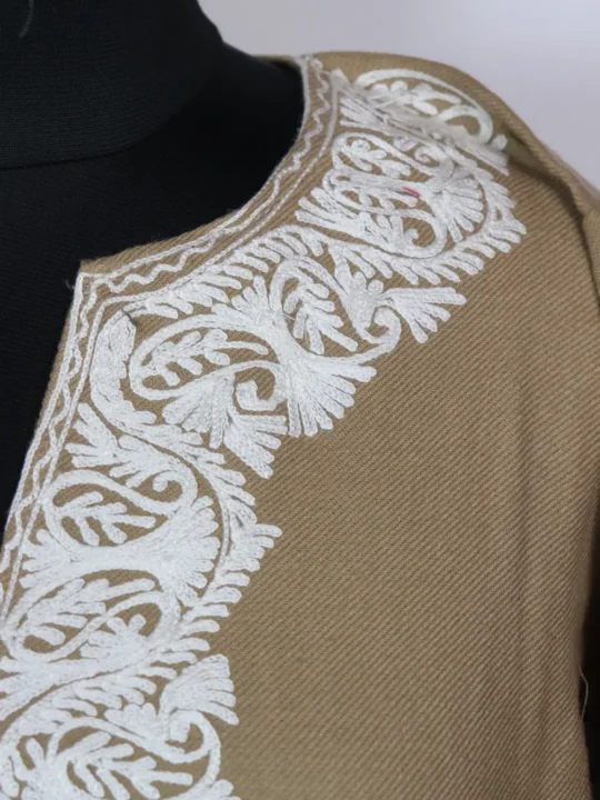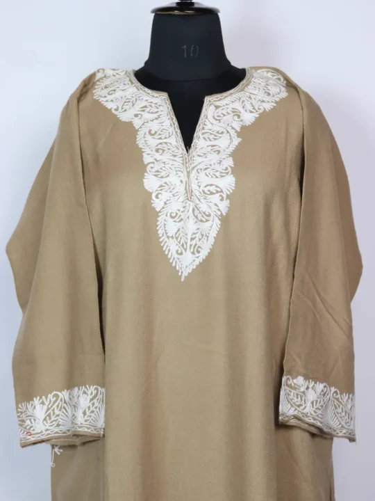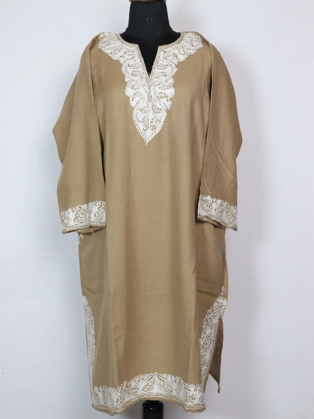 Cashmilon wool in beige and pink-hued Aari work at the neckline and border in continuous badam and floral motifs come together in this pheran, it comes in 54 inch chest size and 44 inch length. This Kashmiri firan keeps the rest of the surface minimal so the neckline and borders becomes the gentle focal point. Order this Pheran to welcome warmth into everyday winter dressing.