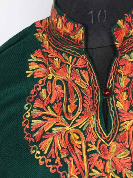 This long kurta highlights graceful Aari floral and badam kadhai placed beautifully around the neckline and across the collar.