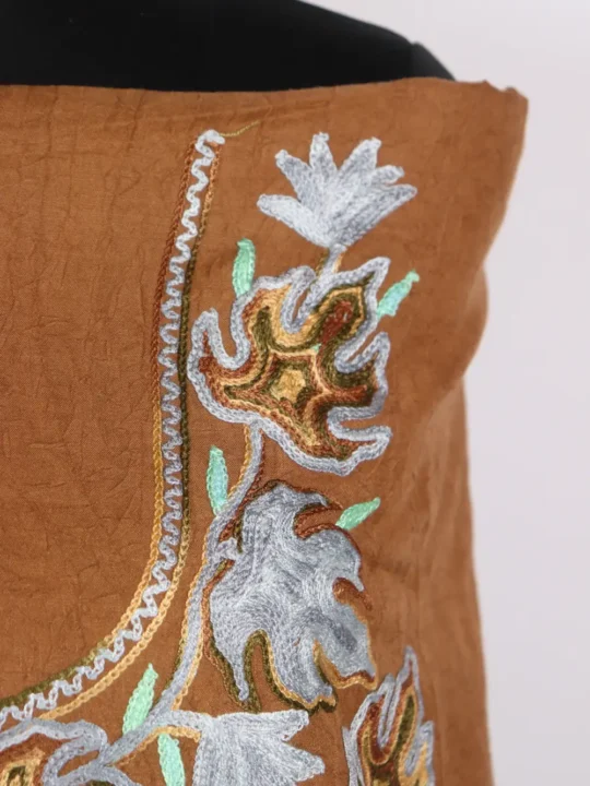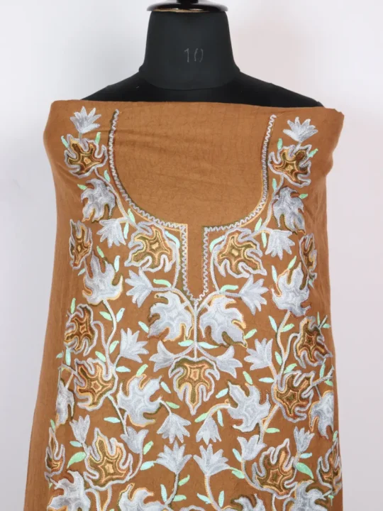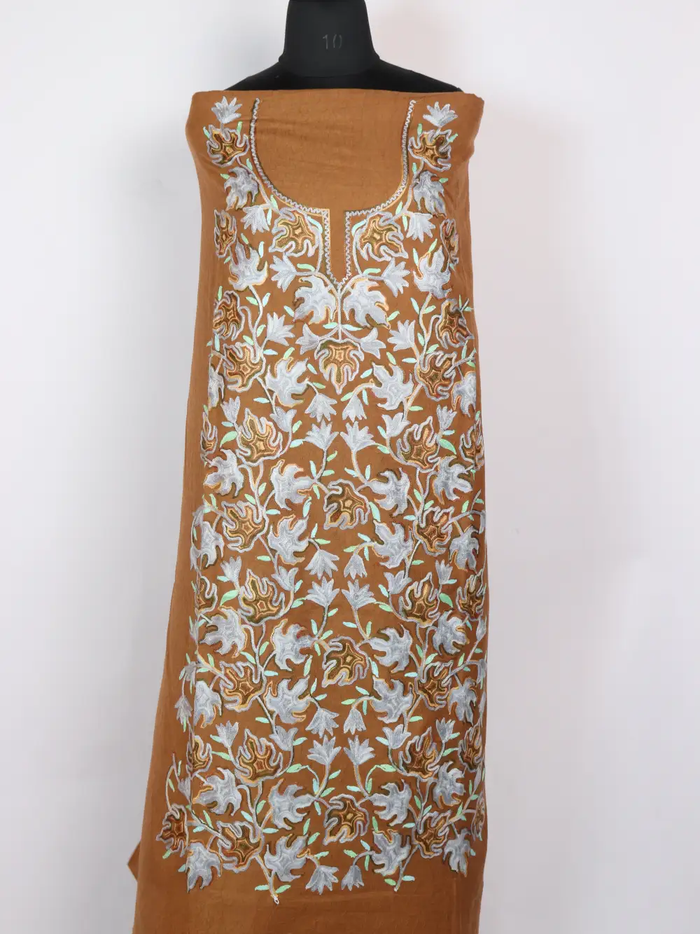 Crafted in crush cotton, this brown unstitched two-piece suit is decorated with brown and grey Chinar motifs spread all over the suit, done in Aari embroidery. The fabric feels light and airy, which makes it an ideal choice for warm days. Since it comes unstitched, you can tailor it to your own style and comfort. It is a practical yet elegant option, it allows beauty and versatility in one garment.