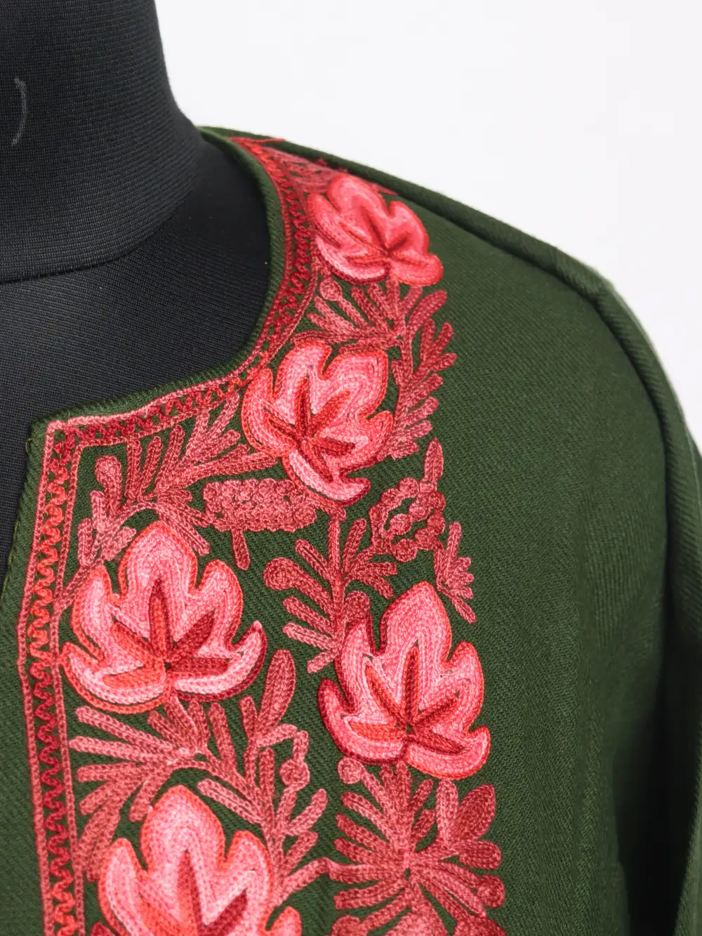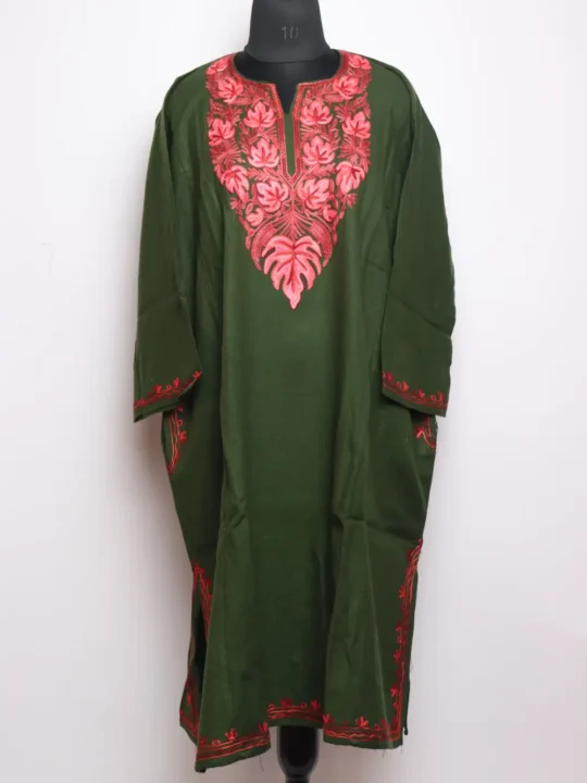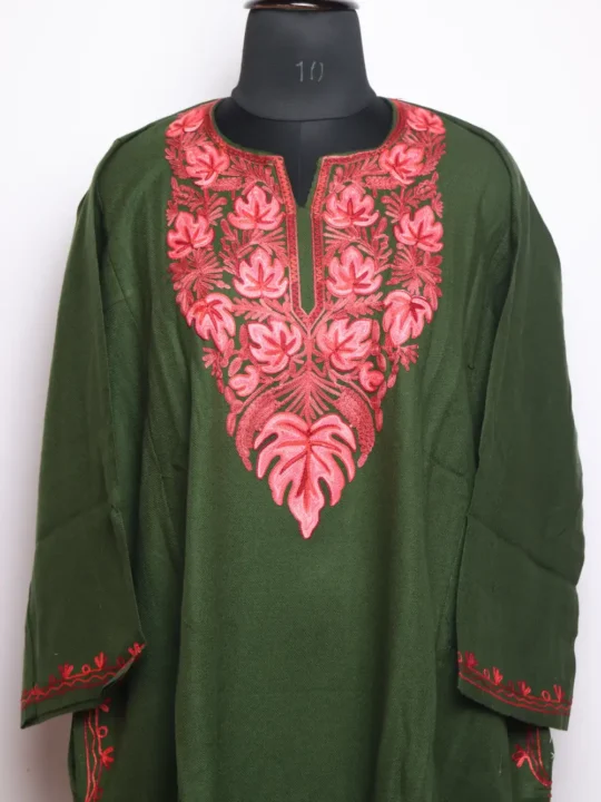 The neckline has beautiful chinari aari kadhai which adds a neat and graceful detail to this cashmilon faran.