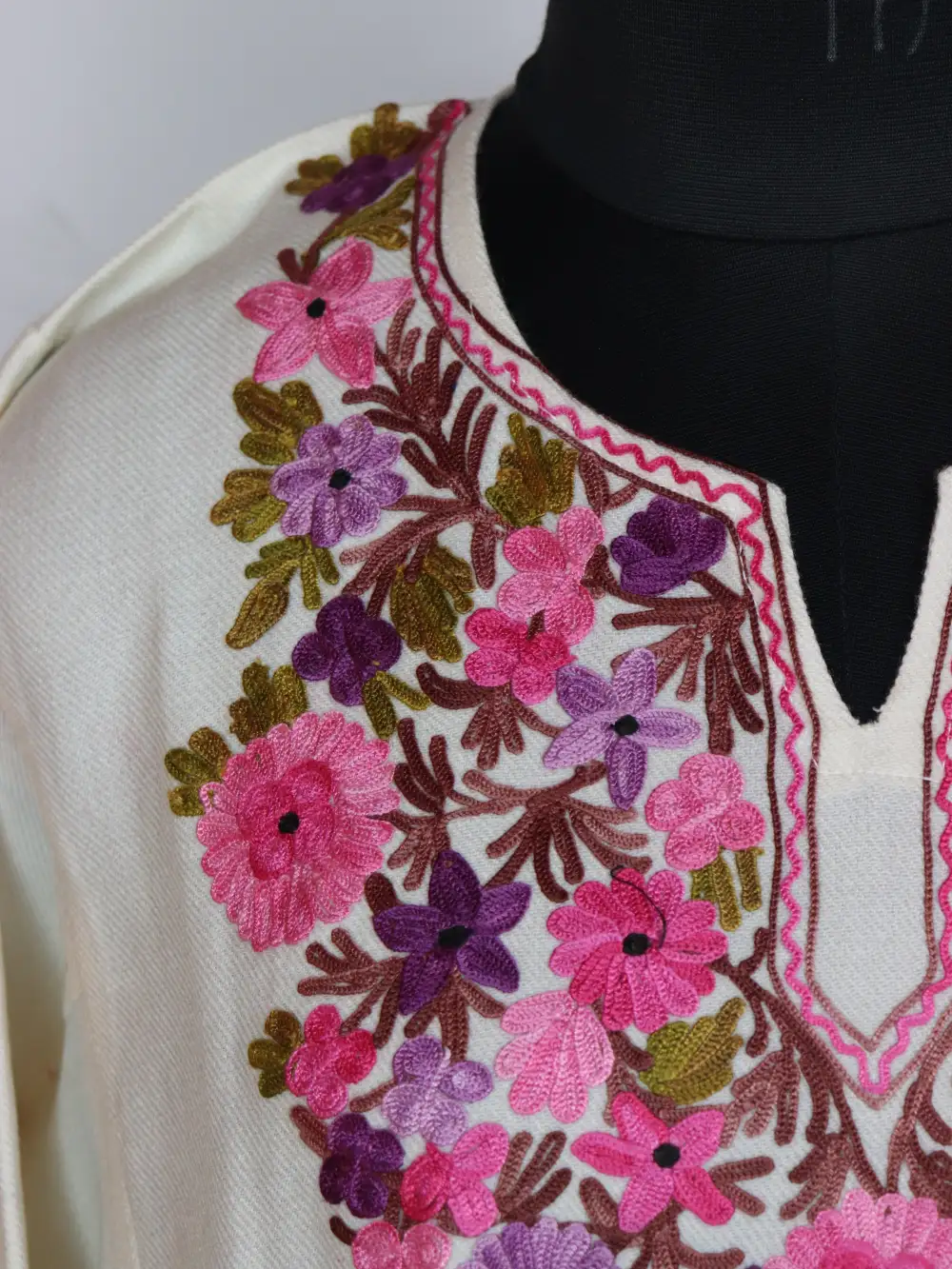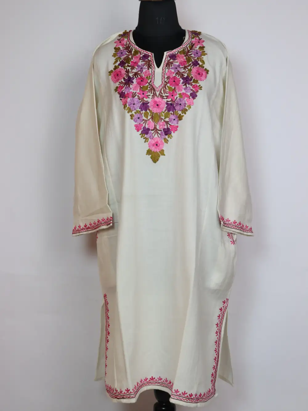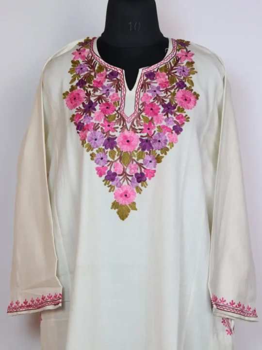 Cashmilon Wool firan in white colour carries Aari embroidery at the neckline in floral motifs. Its chest size 52 inches length 44 inches give a relaxed drape.