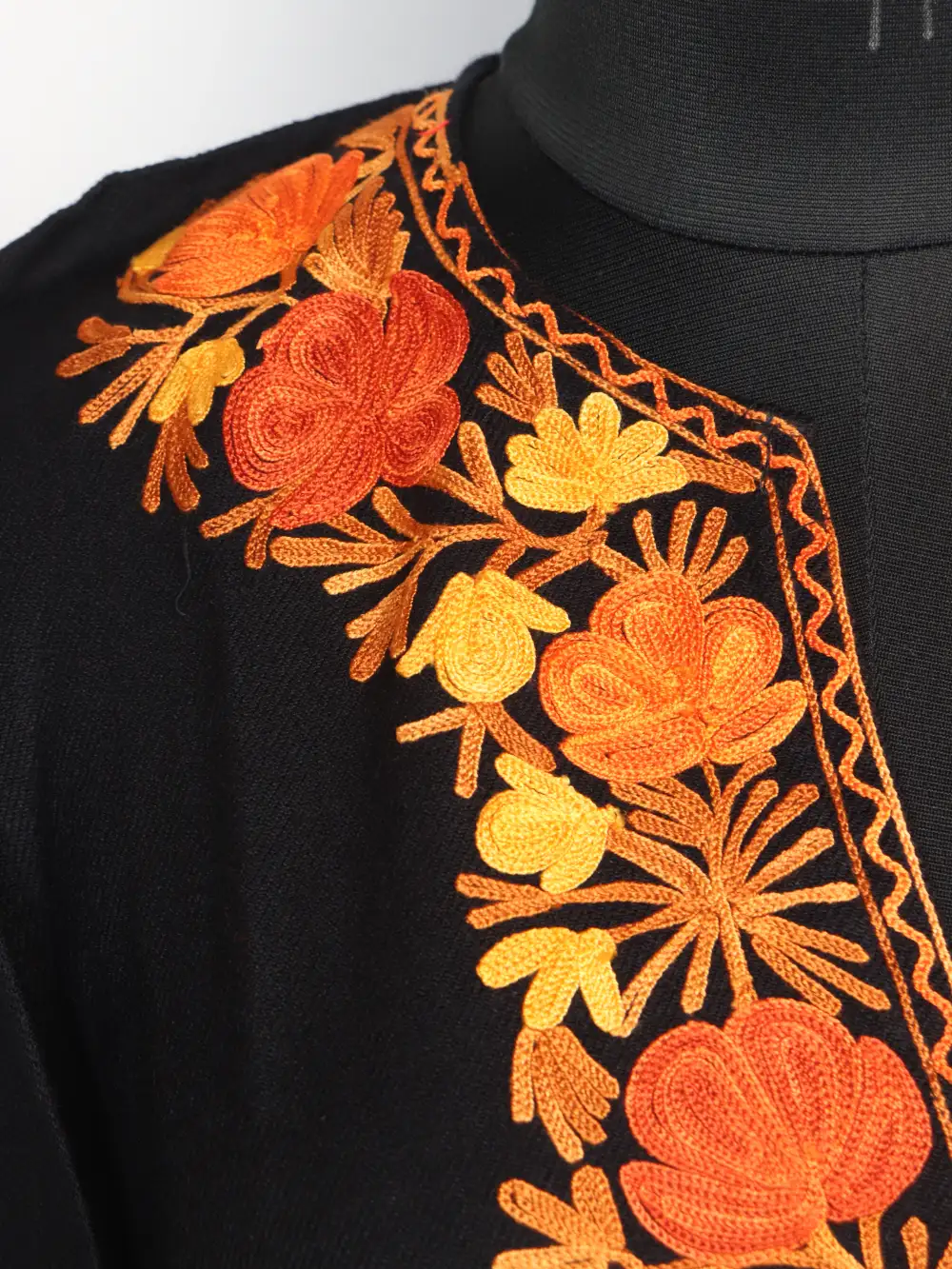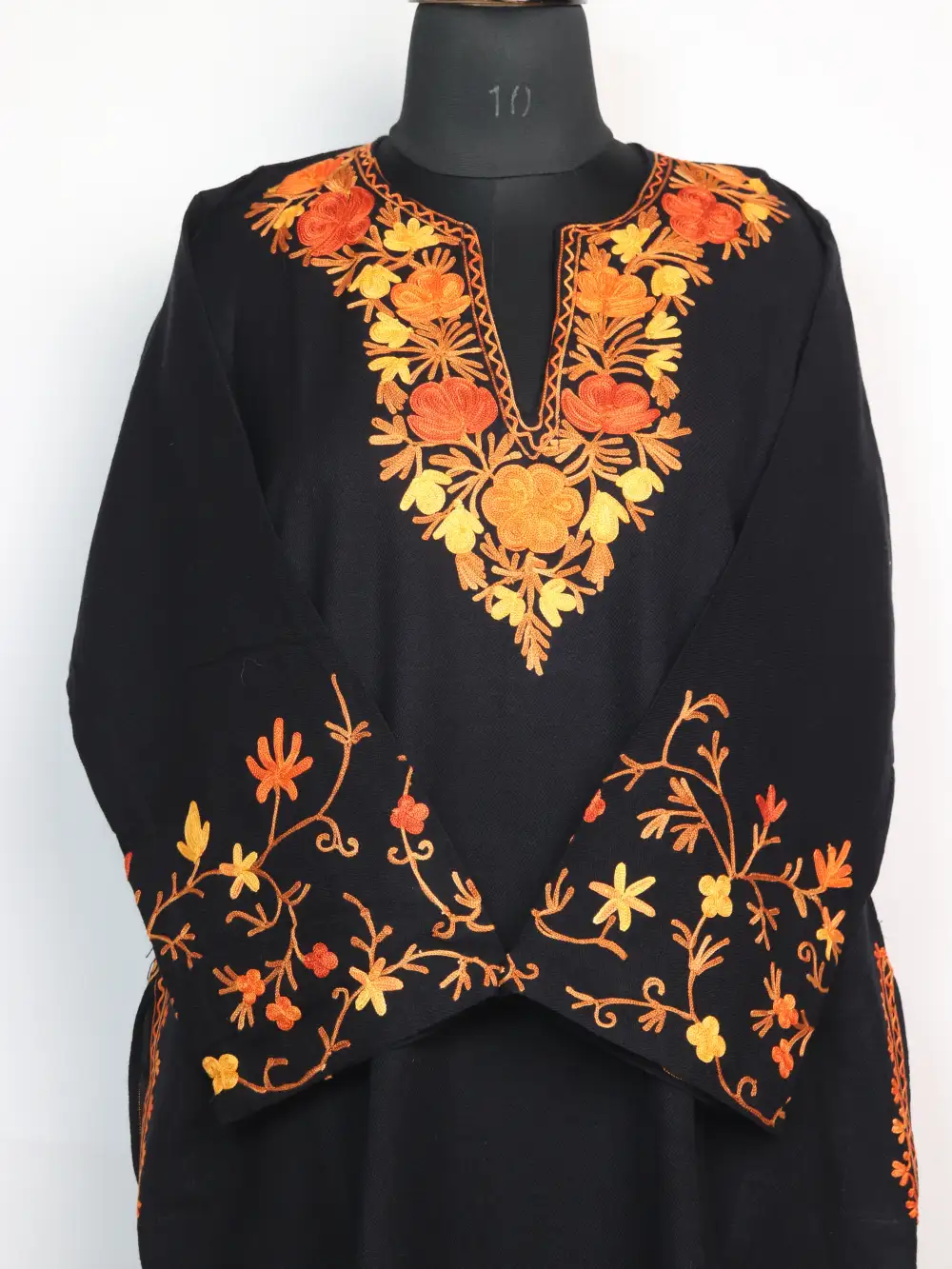Black Cashmilon wool Stylish Kashmiri pheran carries Aari work around the neckline, sleeves and border in floral jaal patterns to brighten the face, Its chest size 52 inches and length 44 inches give a roomy, graceful fall. This stylish Kashmiri pheran reads warm and simple, made to layer easily and feel quietly Kashmiri.