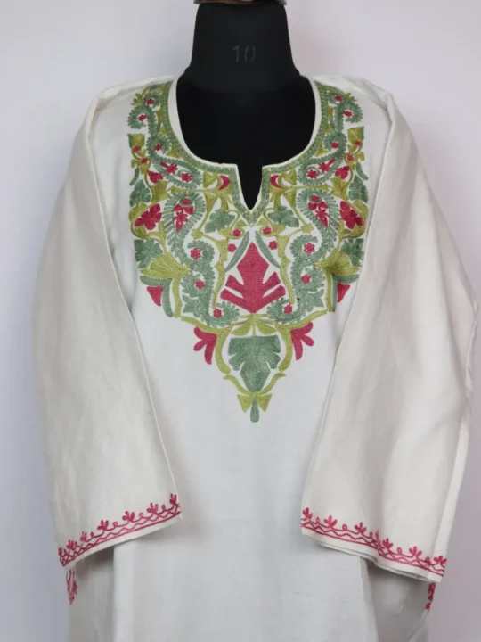 This white pheran in Cashmilon Wool features floral Aari work around the neckline. This pheran reads calm and Kashmiri, offering steady warmth and a tidy neckline accent suited to daily layering.