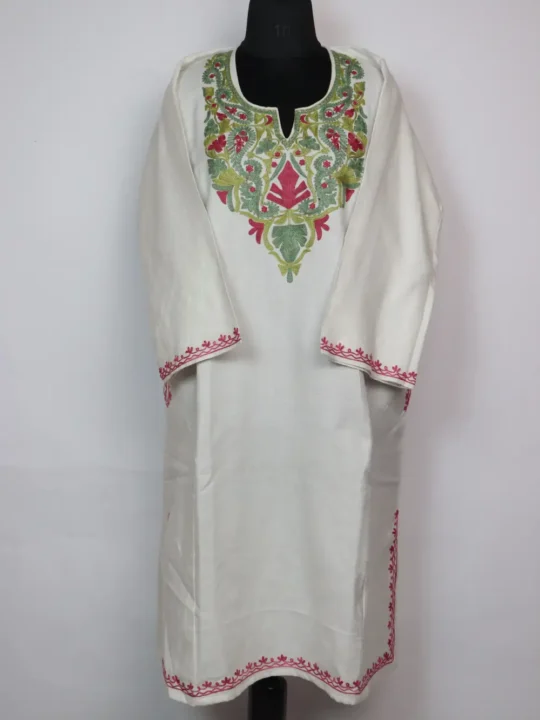 This white pheran in Cashmilon Wool features floral Aari work around the neckline. This pheran reads calm and Kashmiri, offering steady warmth and a tidy neckline accent suited to daily layering.