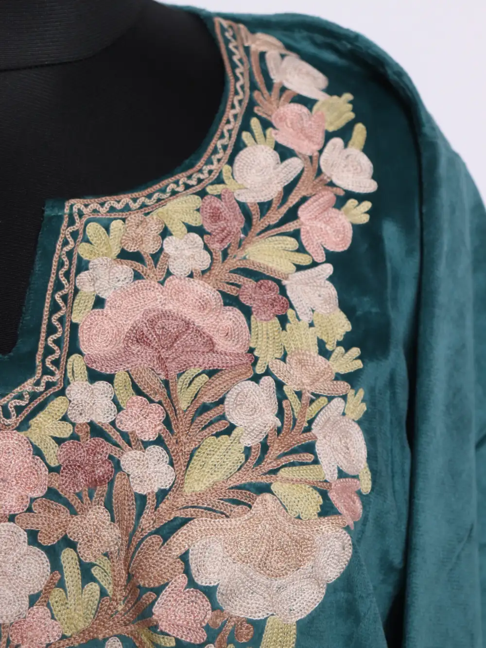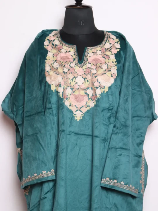 Makmal body meets floral Aari neckline in green and brown hues on this Kashmiri Pheran which is sized with a 60 inch chest and 43.5 inch length for comfortable layering. This sea green feran blends soft warmth with aari kaam that frames the face and keeps the look clean. You can wear it with simple bottoms or layer over winter shawls, it is a natural choice for anyone browsing kashmiri aari work pheran lists for refined neckline embroidery.