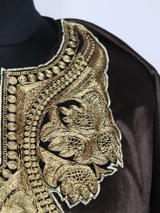 A refined Kashmiri Pheran in chocolate brown colour holland velvet, it is detailed with Zari Tilla floral patterns at the neckline, carries visible and elegant work with soft volume — Its chest size is 58 inches and Length 44.5 inches provide a relaxed fit.