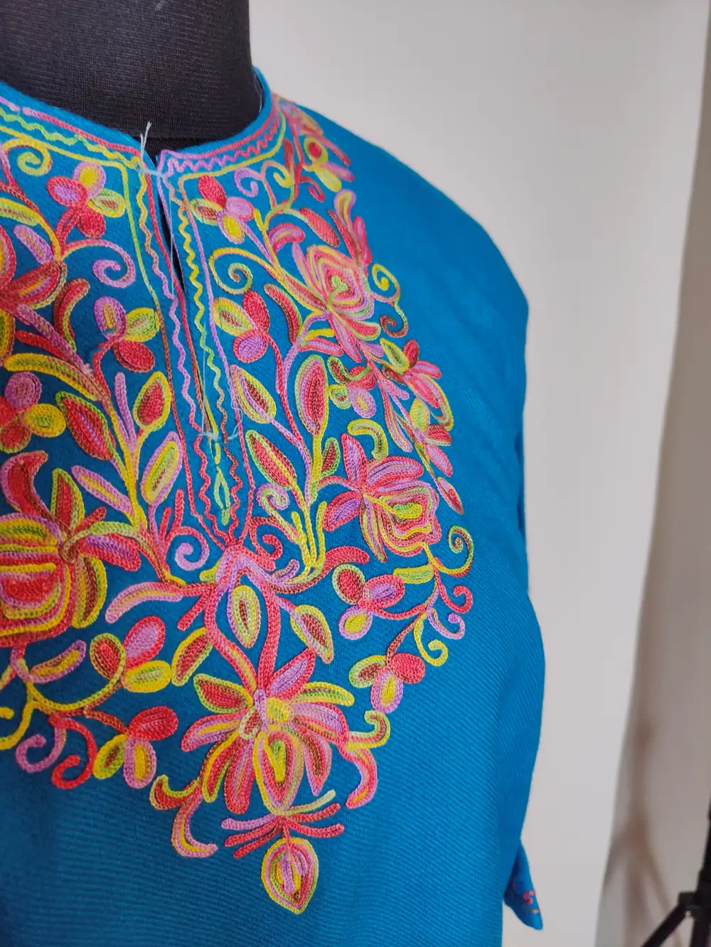 This blue colour phiran drapes in cashmilon wool and glows with aari embroidery placed at the neckline in floral motifs. It is designed with chest size 42 inches and length 30 inches for an easy, warm fit for young girls.