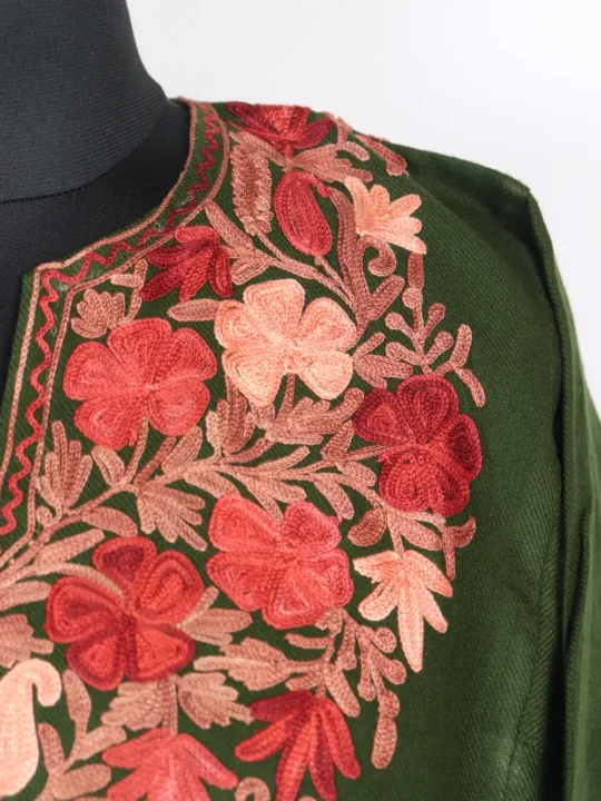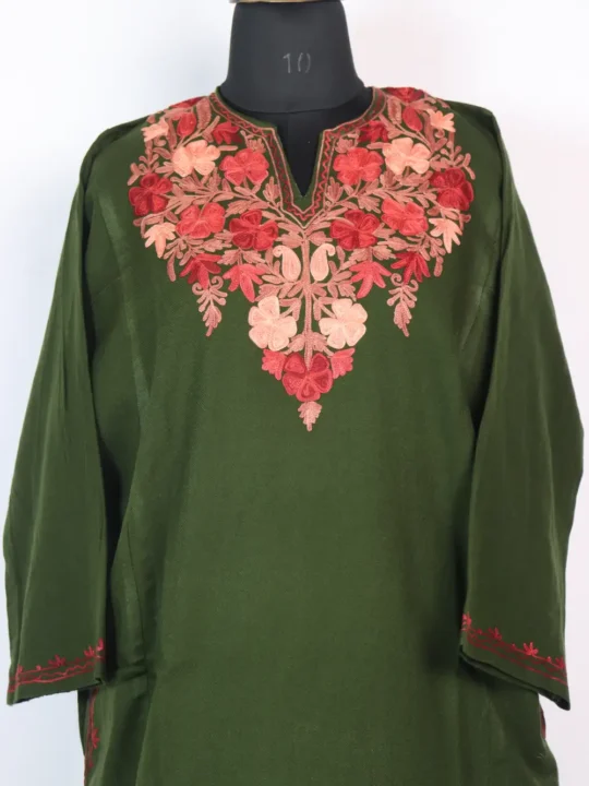 The iqra pheran in green Cashmilon wool carries Aari embroidery at the neckline in pink badam and florals with red florals on brown vines. It comes in 43 inches in length and 50 inches chest, it fits comfortably and layers effortlessly. It is made suitable for winter outings or casual gatherings, this pheran appeals to anyone who are searching for a pheran online. Its soft warmth and traditional design create a versatile winter wardrobe essential.